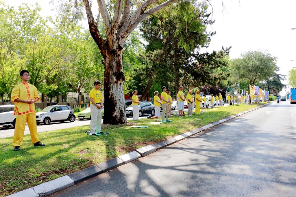 图11:2019年7月20日,法轮功学员在中共驻西班牙大使馆前炼功。