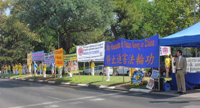一位修女静静地观看法轮功学员们演示功法,并浏览竖立在道路两旁的酷刑展板。现场的一位法轮功学员走过来跟她讲真相,她静静地听了十多分钟。在了解到法轮功学员遭受迫害以及被活摘器官的真相后,她在反对迫害的征签表上签下了自己的名字。临走之前,她又向法轮功学员多要了十多份传单。她说,要把迫害真相带回去,传递给更多的人。