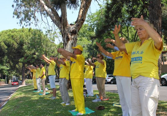 图8:2019年7月20日,法轮功学员在中共驻西班牙大使馆门前炼法轮功第二套功法