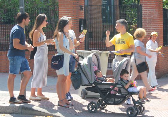 图12:2019年7月20日,法轮功学员在中共驻西班牙大使馆前向民众讲真相。