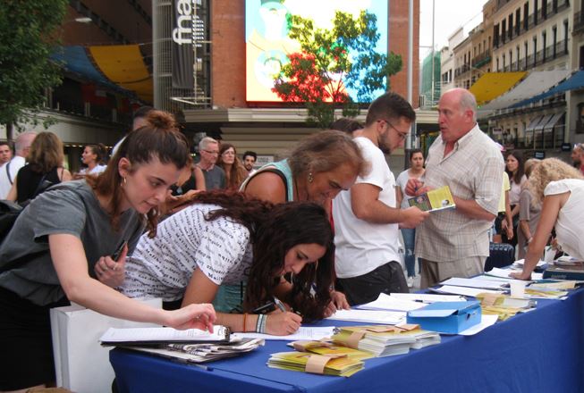 图13:2019年7月19日,西班牙民众在马德里Callao广场上签名支持法轮功。