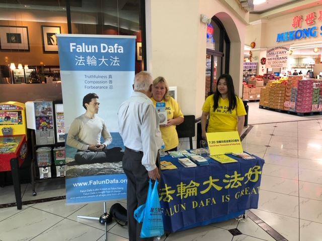 第一个真相点设立于Lee Lee 国际超市门前。当地的法轮功学员在那里设立了真相展板。立刻吸引了一名西方人克里斯(Chris)驻足拍照。他兴奋地与一名法轮功学员交流道,他一九九九年迫害开始的时候就在中国做生意,他亲眼目睹了中共对法轮功学员的造谣宣传。由于他了解六四的真实情况,当时他对于一九九九年中共发动的对法轮功,一群信仰“真、善、忍”的好人的迫害并不惊讶,他已了解中共的残暴本性。二十年后的今天,有缘人克里斯(Chris)又在美国见到了法轮功,他很兴奋又有机会了解了,最后拿了一本明慧杂志回去看。