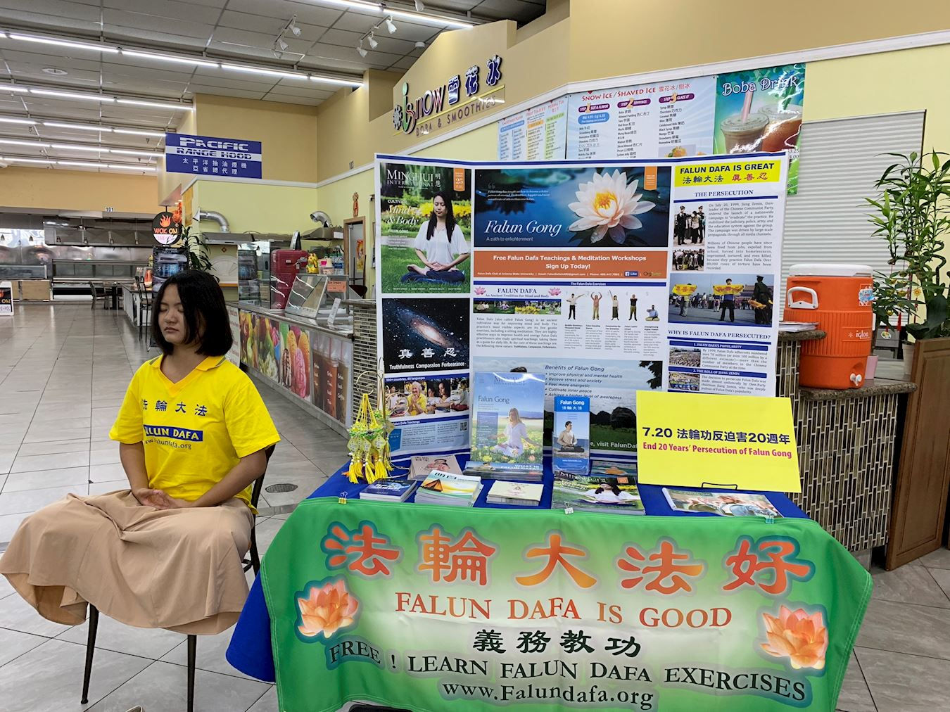 第二个真相点设立于Mekong国际超市里面。这个超市里有数家中国餐馆,因此中国人,华人很多。一名中国女士来到真相点前,与法轮功学员谈到共产党的暴政,她深知共产党对中国老百姓的谎言欺骗。但是话风一转,她又说法轮功也不好。学员就与她讲解了天安门自焚事件是造假新闻,法轮功严禁杀生,自杀,这是中共自导自演的一场闹剧,已经被国际社会认清了真相。那名女士听后觉得惊讶,因为她在国内都看不到这些消息,她所知道的都是中共灌输给她的。后来她高兴地拿了一本《·九·评*共产党》回去阅读了。后来陆陆续续来了一些中国人在真相点前驻足观看,有些人见到西人法轮功学员,还很惊讶。后来法轮功学员告诉他们,法轮功洪传世界,唯独在中国被迫害。他们听后更容易接受真相资料,并且纷纷表示同情。