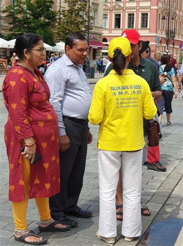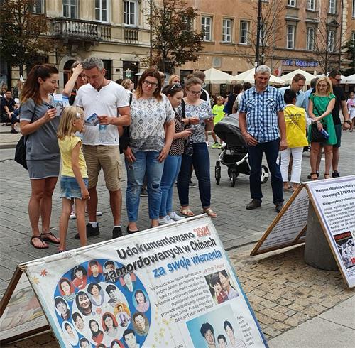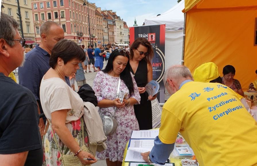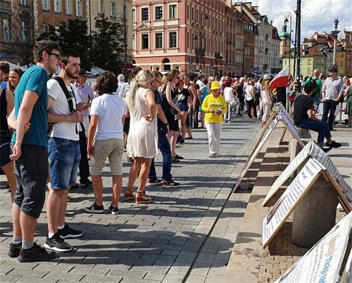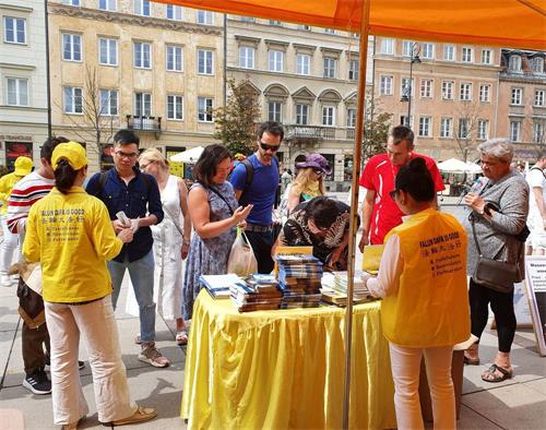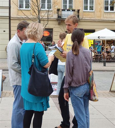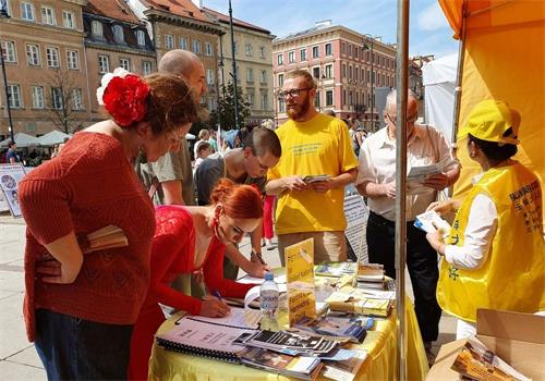 明真相的民众和游客们一位接一位的在给波兰政府的请愿书上签名,支持法轮功学员的正义之举,也有很多人记下华沙炼功点的地址和教功时间,还有人现场购买波兰语《转法轮》及《大圆满法》,几乎每个人在走前都向法轮功学员再三致意,祝法轮功学员好运。