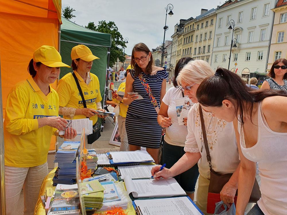 时值全球法轮功学员反中共迫害二十周年之际,波兰法轮功学员特别推出向波兰参、众两院院长及波兰总理的请愿书,呼吁波兰政府直面中共二十年来对法轮功学员的残酷迫害及大规模活摘器官的反人类罪,促法办元凶解体中共,为终止地球上前所未有的邪恶承担波兰政府应尽的道德责任。请愿书受到不同语言游客及波兰民众的积极响应,大家纷纷在请愿书上签名,支持法轮功反迫害,并为法轮功学员送上真诚的祝福。