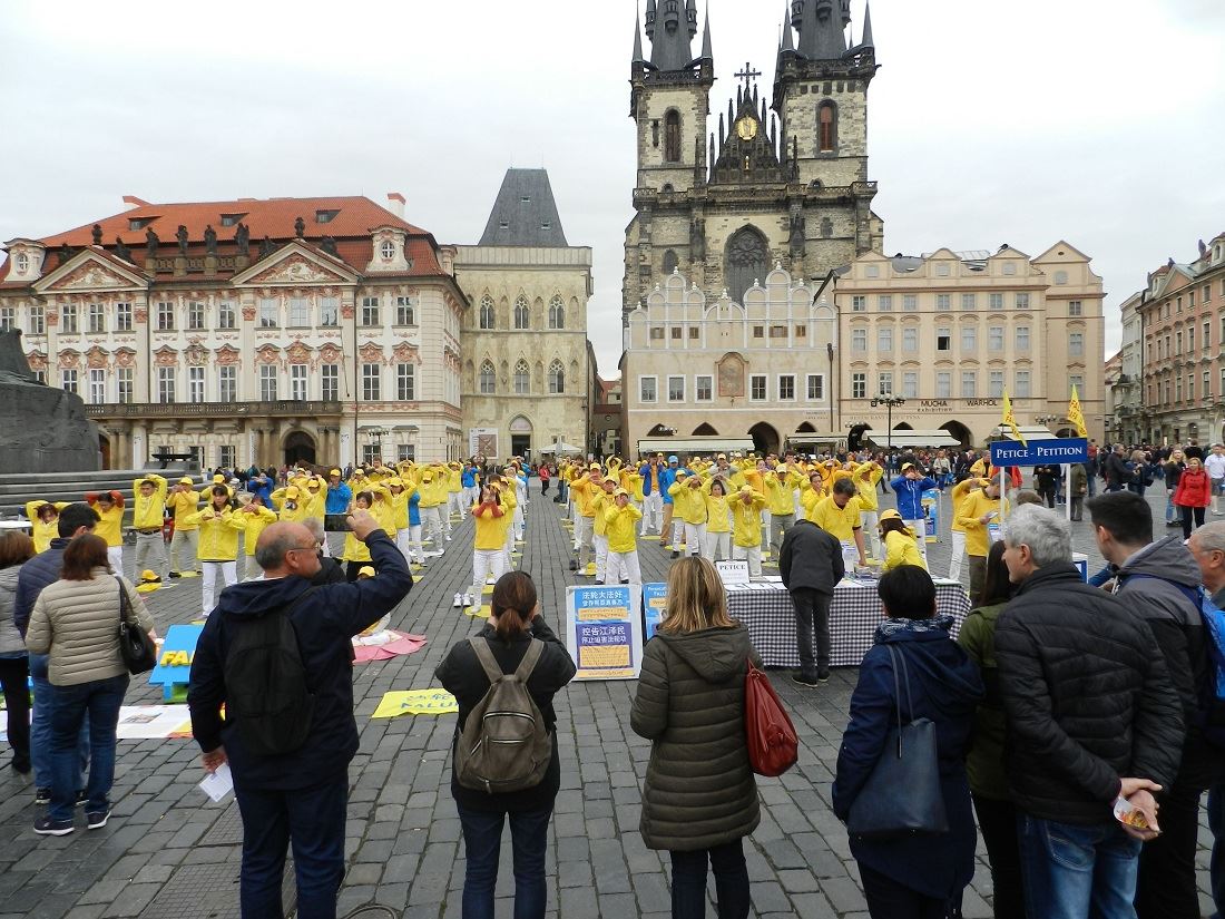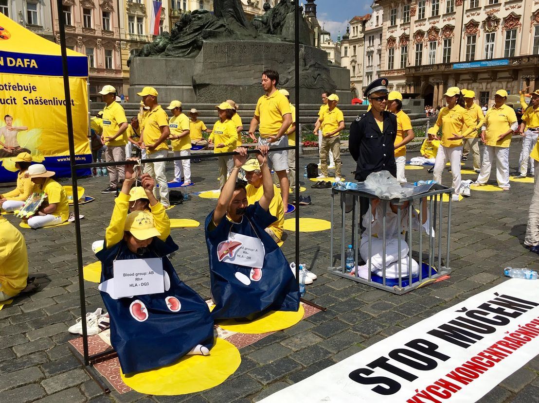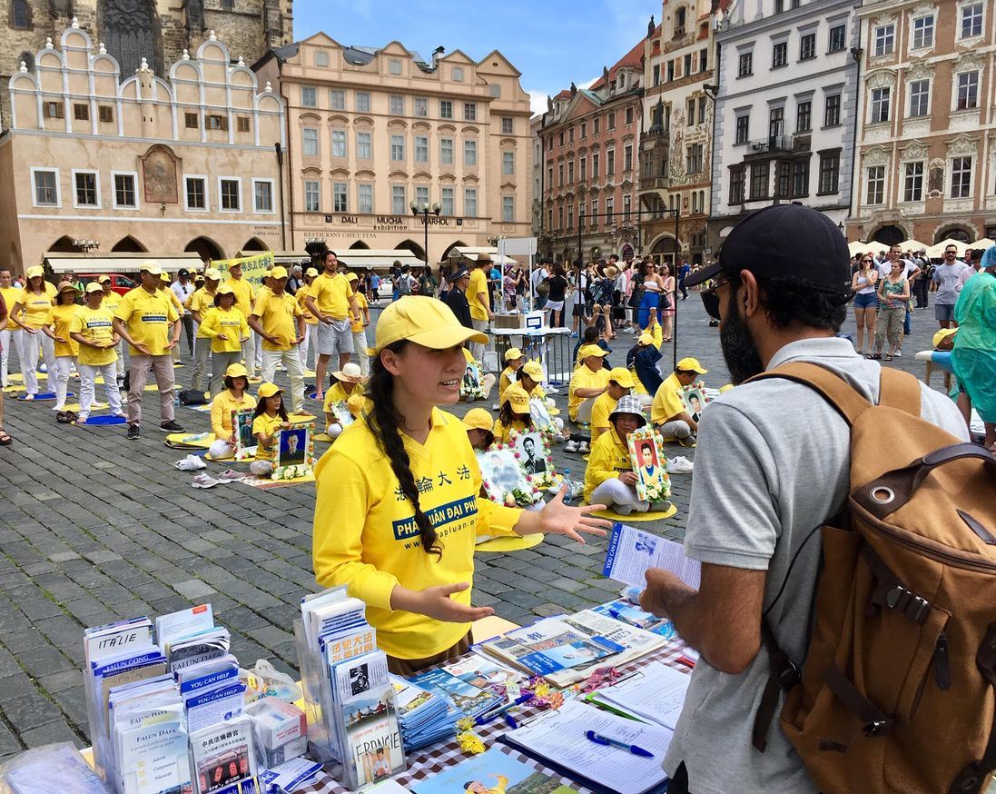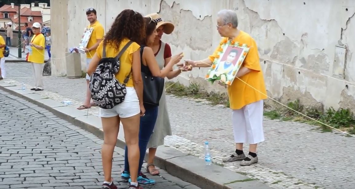 布拉格的抗议活动于七月二十日继续进行。二十日上午,在中共大使馆前集会并烛光悼念被中共迫害致死的法轮功学员,呼吁法办迫害元凶江泽民。模拟活摘器官及酷刑,抗议和谴责二十年来中共对法轮功学员的血腥镇压与残酷迫害。宣读了致大使张建敏先生的公开信,向他讲真相,并呼吁他认清当前形势,能正确对待法轮功问题,不要参与迫害法轮功。二十日下午,法轮功学员在老城广场举行各种活动:向游人演示五套功法,模拟活摘器官,酷刑演示,派发各种文字的真相资料,向中国大陆游客讲真相劝“三:退.”等活动。