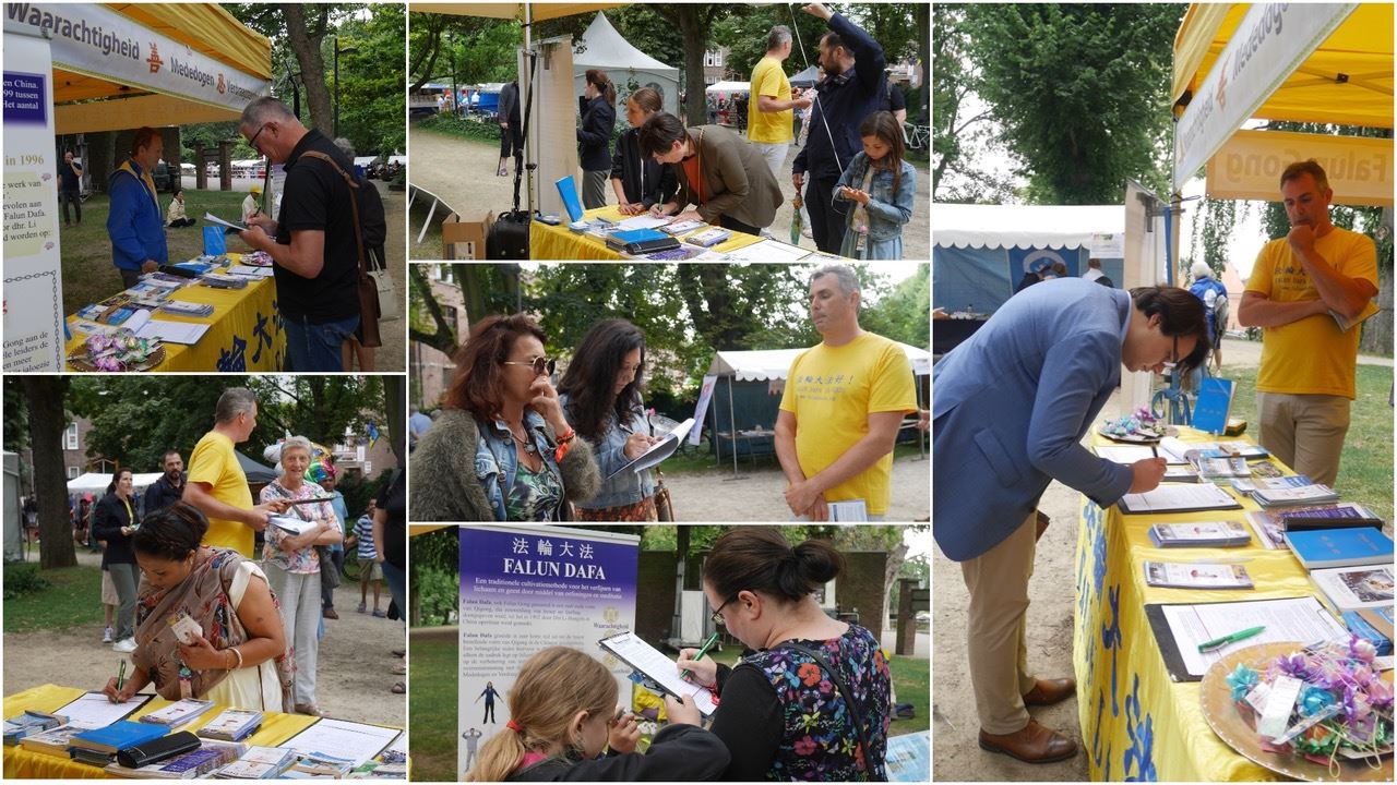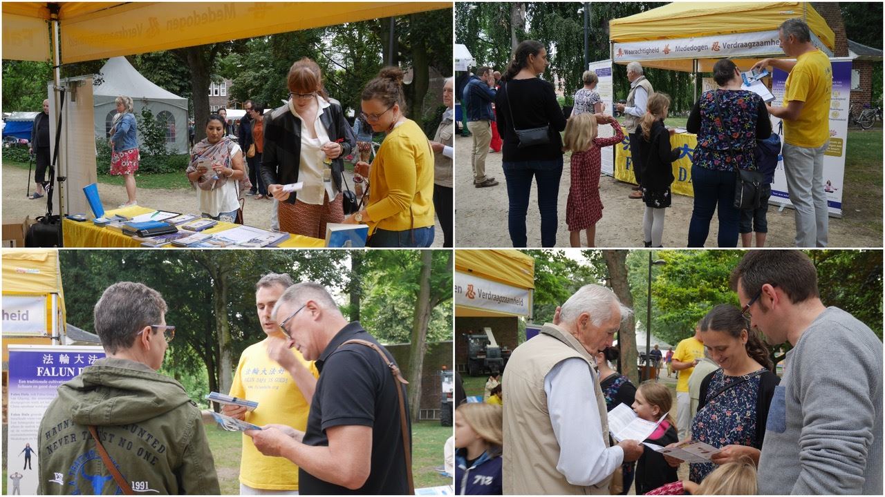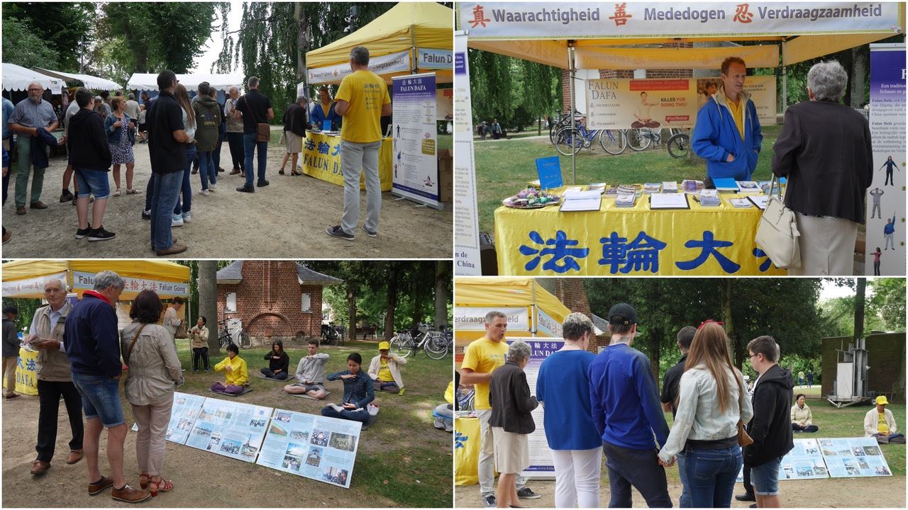 市民三三两两地来到法轮大法展台,饶有兴趣地观看学员展示法轮功功法,观看之余人们也来到展台前观看资料,有的人直接与法轮功学员攀谈,听说有免费教功,就询问哪里可以学炼功法。两位妇女咯特(Lot)和费若(Vero)来自哈索特(Hasselt),得知那里也有炼功点,很高兴能够在居住地也能够学炼法轮功。