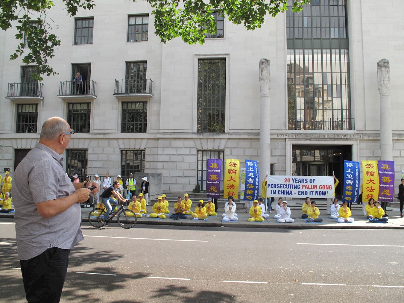 ![]() 图1:二零一九年七月二十日,法轮功学员在伦敦中使馆前炼功静坐集会,路人驻足观看。 |
