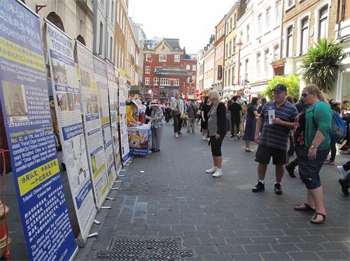 ![]() 图3~4:二零一九年七月二十日,在伦敦唐人街上,不断有人驻足观看法轮功真相展板,其中包括很多中国人。 |