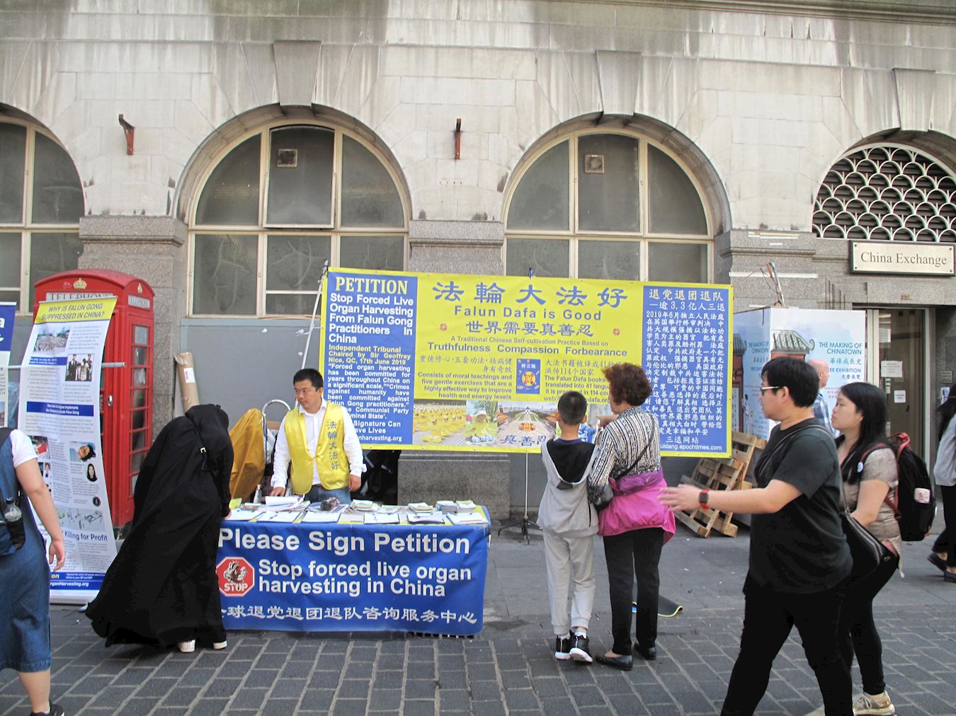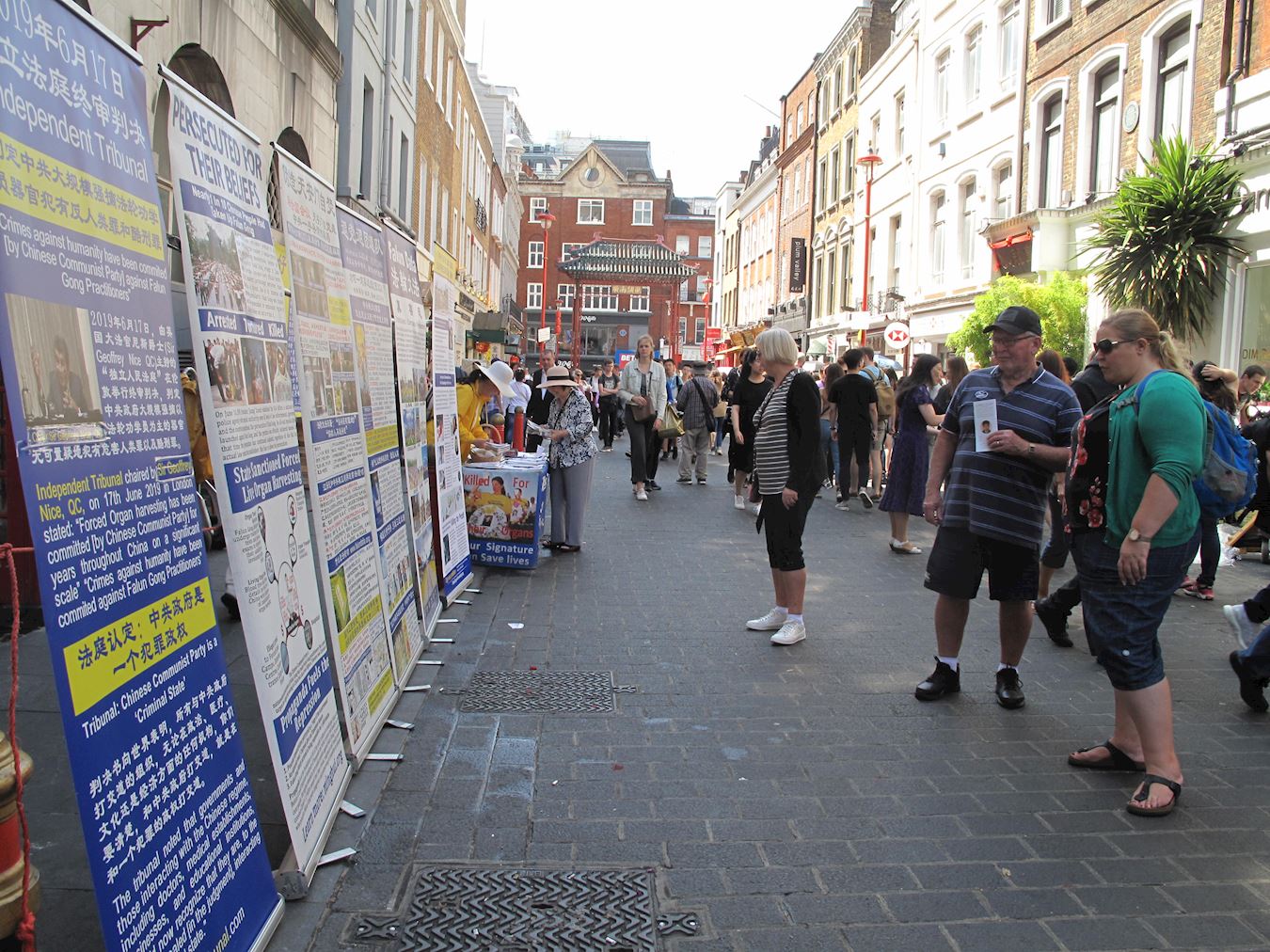 ![]() 图2:在伦敦唐人街,“反迫害二十周年”游行队伍让一对英国夫妇第一次看到法轮功真相,他们马上来到法轮功学员在唐人街讲真相点继续了解真相,并签名支持制止迫害。 |