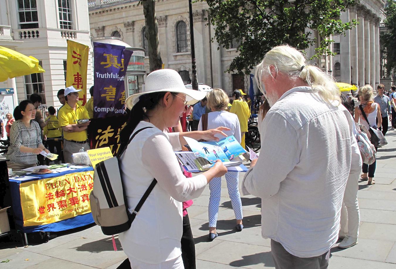居住在伦敦的女士菲(Fay)已经退休,她以前听说过法轮功,当天,在伦敦圣马丁广场,她主动加入法轮功学员“反迫害二十周年”活动,向路人发放法轮功真相传单。菲表示,希望自己能为制止中共对法轮功的迫害出一份力,她也希望英国政府站出来反对中共政府的人权迫害。