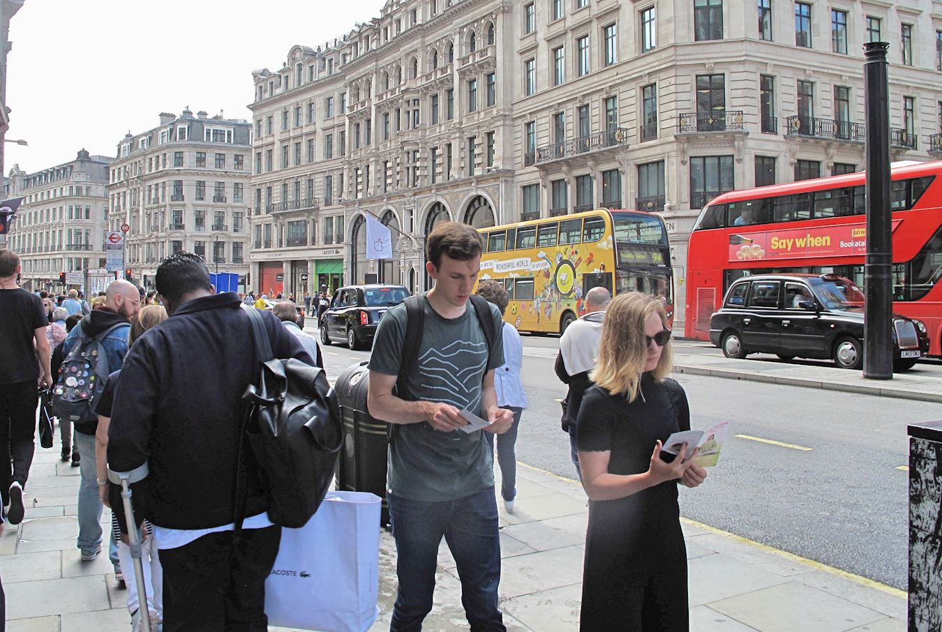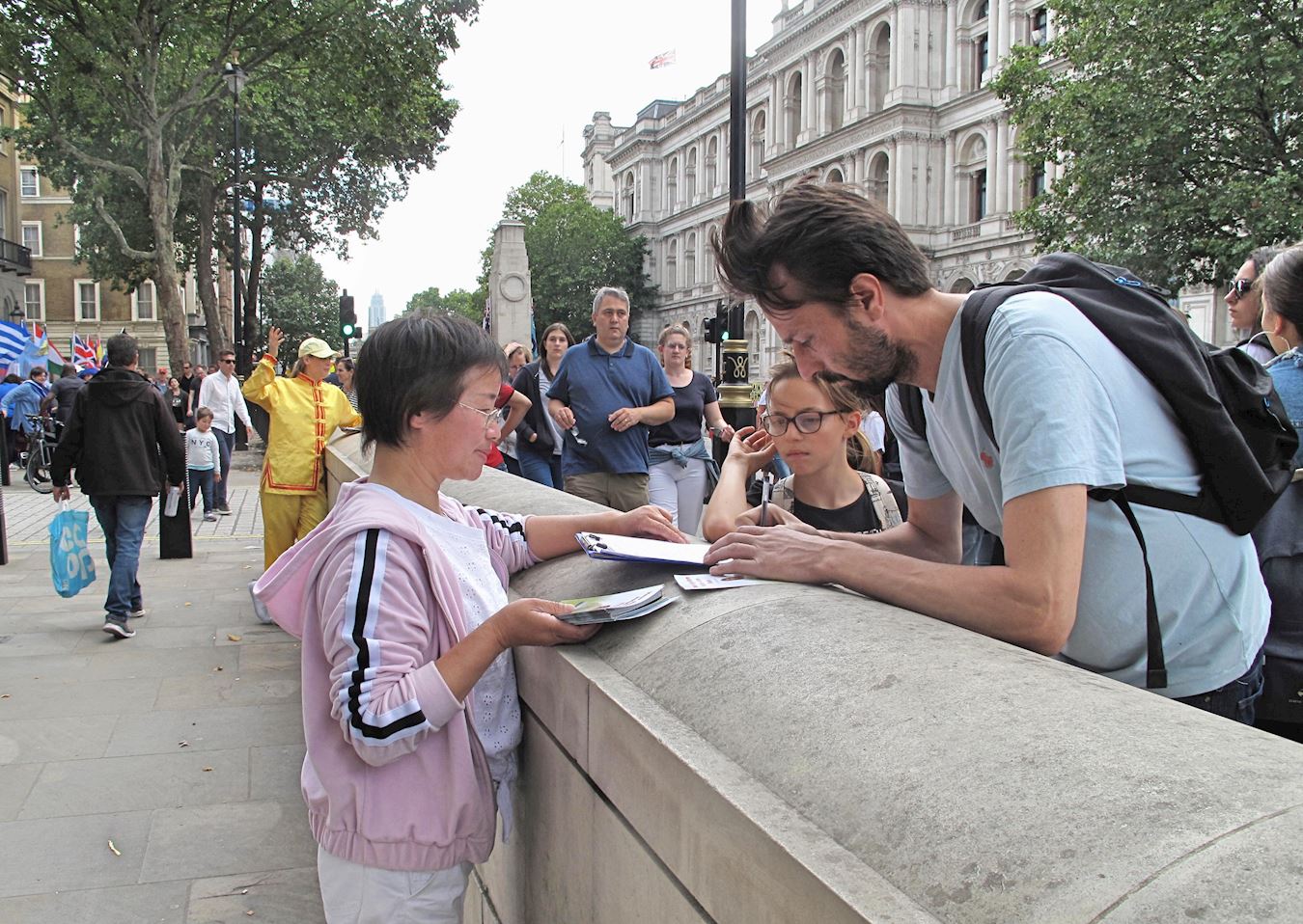 ![]() 图9:二零一九年七月二十日,在唐宁街10号首相府前,两位从丹麦来伦敦旅游的年轻人在听法轮功学员讲真相后签名反迫害,并表示要上网进一步了解真相。 |