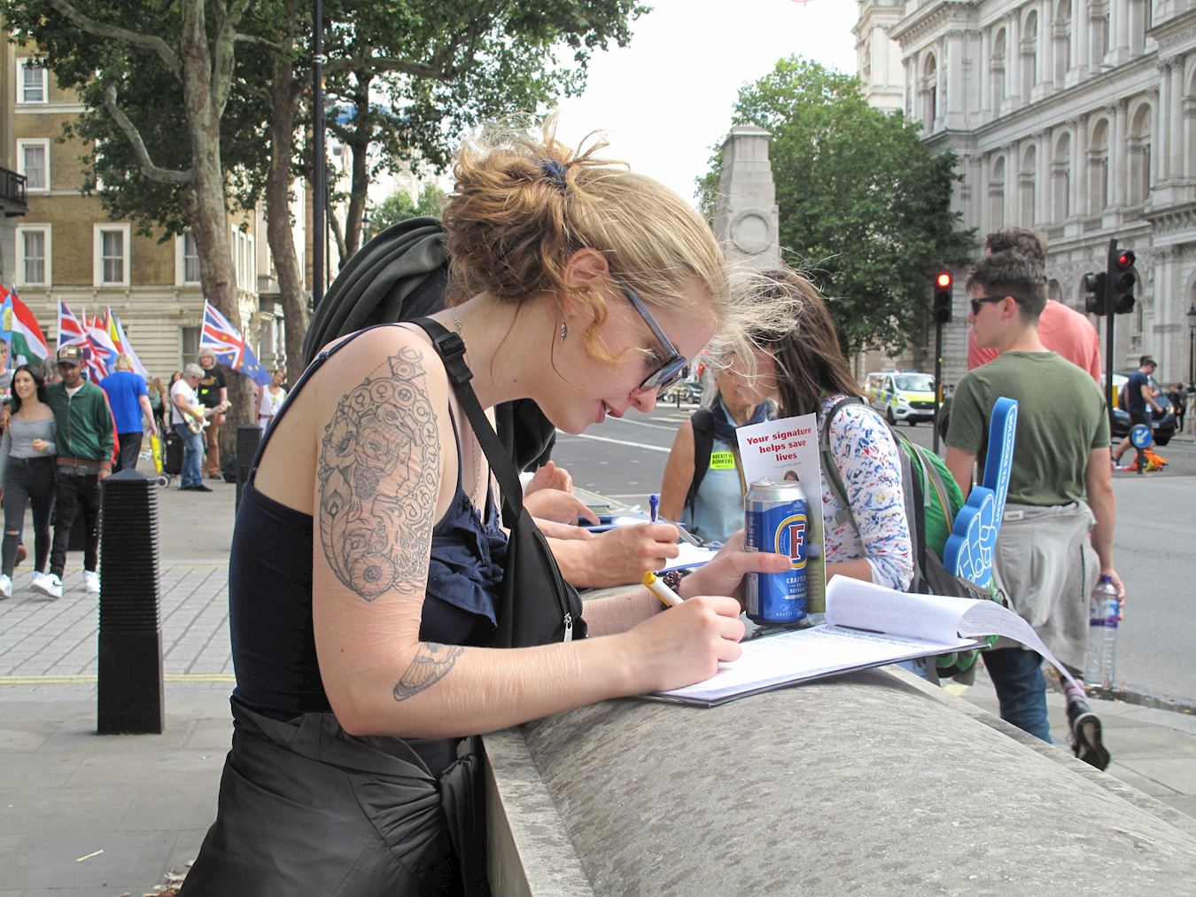 ![]() 图10:二零一九年七月二十日,在唐宁街10号首相府前,民众在了解真相后签名支持法轮功反迫害。 |