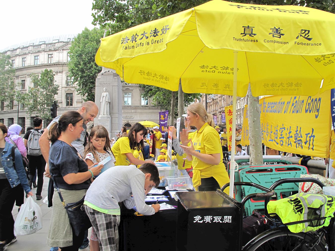 ![]() 图7:二零一九年七月二十日,在伦敦圣马丁广场,这女士(右)被法轮功功法演示所吸引,询问学员真相,并在反迫害征签表上签了名。 |