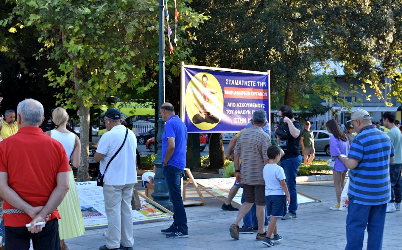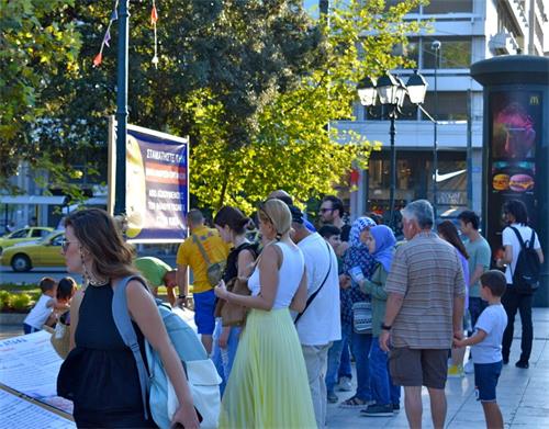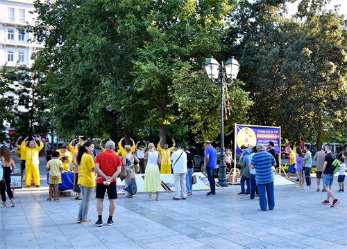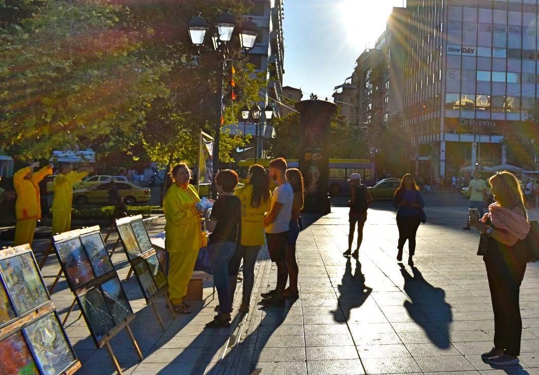 法轮功学员在广场上炼着缓慢圆的功法。炼功场面充满祥和的能量,附近的民众感到很舒服。他们不明白中共为什么用野蛮的方式迫害人民。许多人在要求停止迫害的请愿书上签了名,并希望学炼法轮功。希腊人,还有来自世界各地的游客了解了法轮功被迫害的真相,了解了中共在活摘法轮功学员器官的罪行。