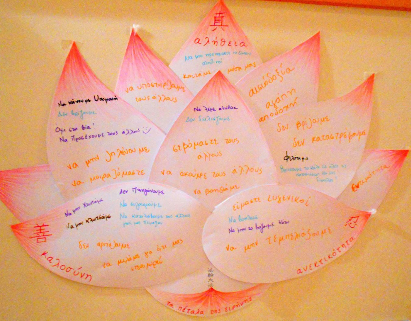 孩子们聚精会神地听了修炼故事“莲花之旅”,并了解了真善忍原则。他们在一朵大莲花中写下了他们的自己的理解,如礼貌、诚意、不放弃、有耐心、关心别人、倾听别人、打不还手和帮助别人等。他们还学画莲花,制作纸莲花。
