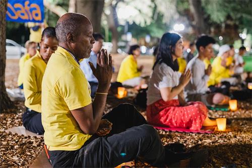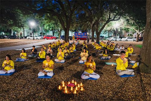 夜幕下,法轮功学员们举起手中的蜡烛,歌声《烛光》响起,“一点点烛光, 一曲曲悲歌, 诉说着修炼者的英雄悲壮……讲述着修炼者的慈悲坚强……传递真诚和善良,把世界照亮……把真善忍的美好传播四方。”