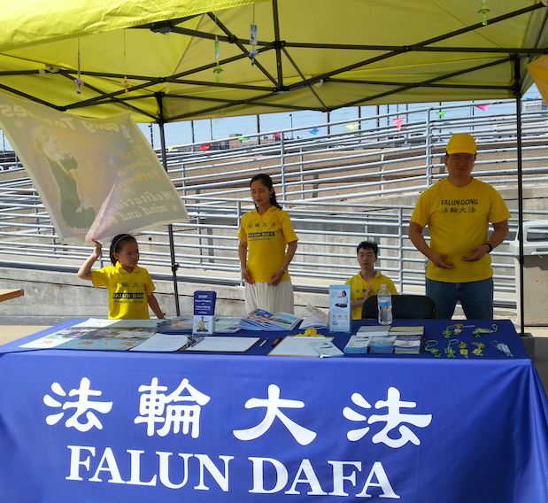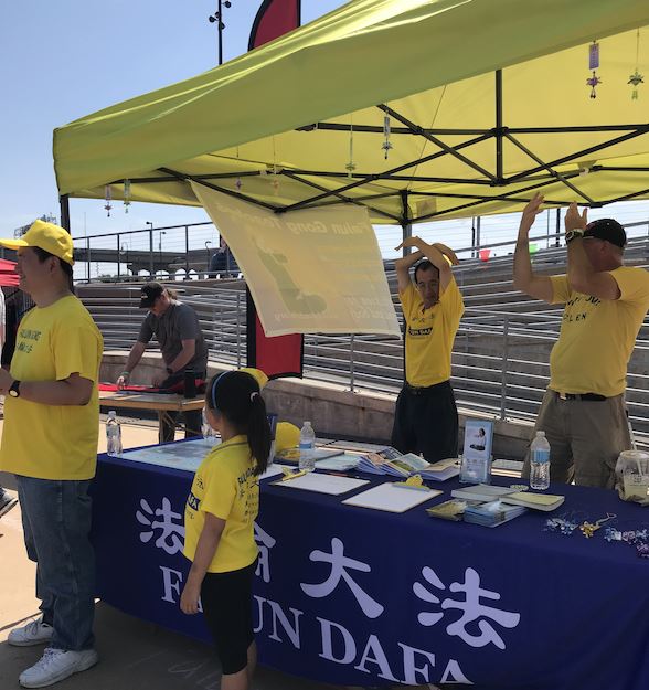 上午十一点亚洲节正式开始,法轮大法的展位位于入口处右侧,很多民众一进门便能看到学员们布置好的展板和祥和的功法展示。尽管天气炎热,却挡不住有缘人陆续来到展位获取“真、善、忍”的美好信息。