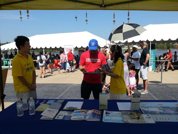 越来越多的民众在听到学员们讲述这场邪恶迫害时不再犹豫,纷纷签名支持反迫害。来自越南的阮(Nguyen)先生表示之前就听说过活摘器官,觉得很震惊,欣然同意在征签簿上签名。居住在附近城市林肯的霍华德(Howard)夫妇听明白学员的详细介绍后,不但自己签名,还叫来他们的朋友帕夫拉克(Pawlack)夫妇共同签名支持。巴西柔术教练詹姆斯(James)先生第一次听说有超过一亿人在学炼法轮功,而对平和修炼者的迫害更是让他觉得难以置信,他在签名后带走许多真相资料,表示自己回去要好好了解一下。一位先生非常同情大法弟子的遭遇,签名后主动询问是否可以捐款帮助学员,学员感谢他的善意并告诉他我们不需要捐款。