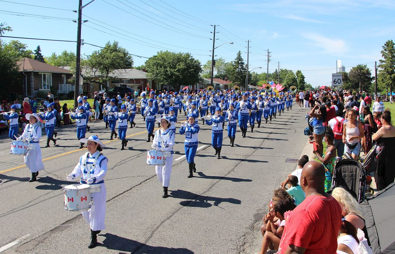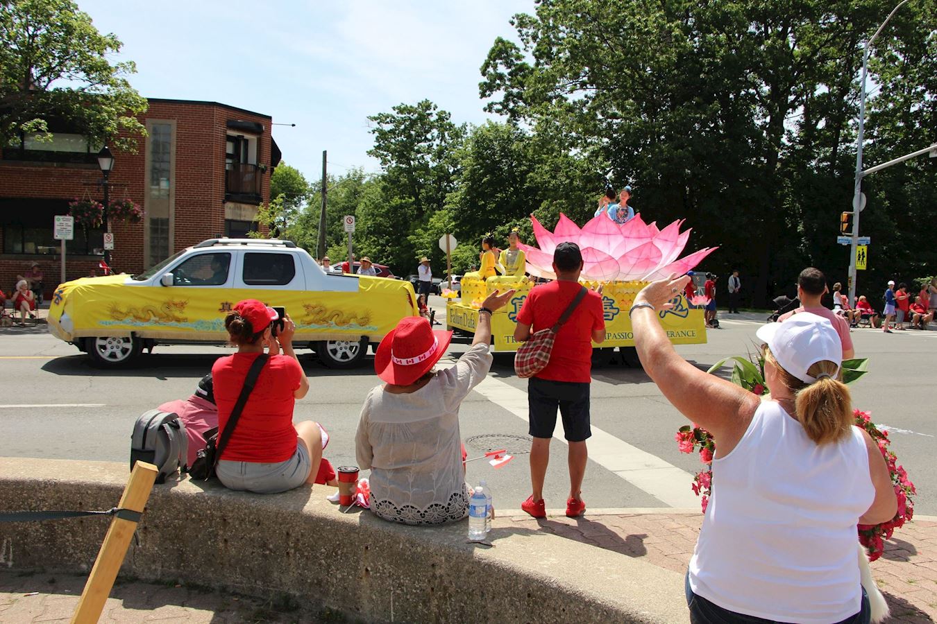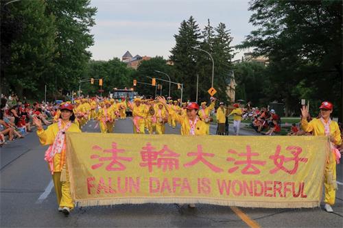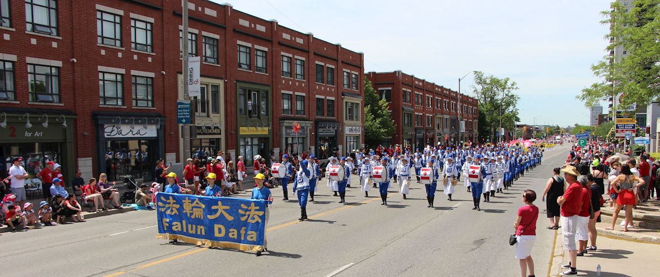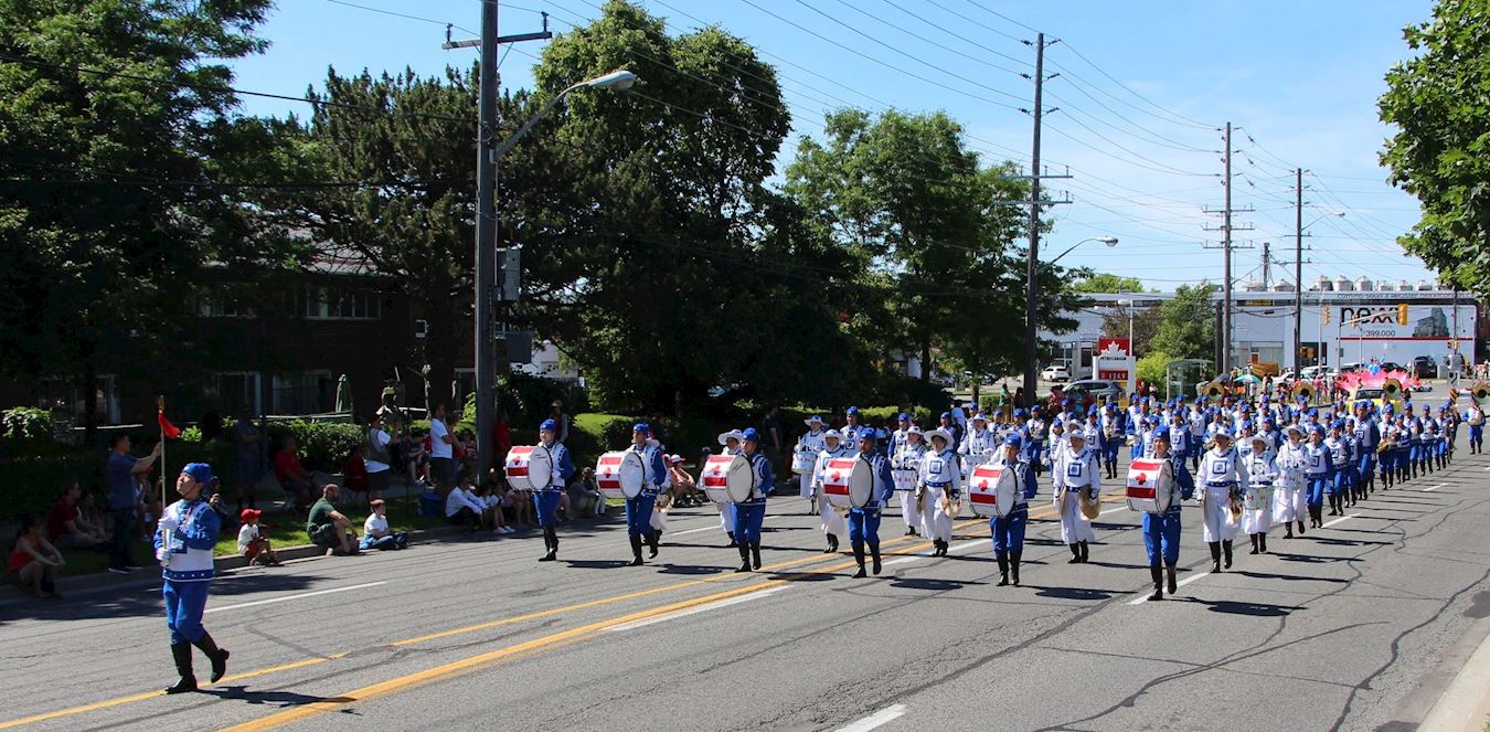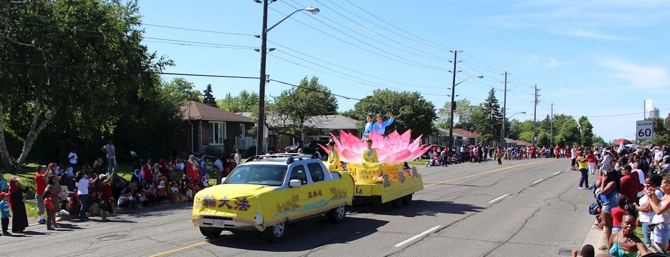 当天上午十一点,天国乐团、花车和炼功队参加了在密西沙加市(Mississauga)的国庆游行;下午四点天国乐团和花车参加了士嘉堡市(Scarborough)的国庆游行;傍晚七点腰鼓队和炼功队开车两小时到斯特拉特福市(Stratford)参加了当地的国庆游行。所到之处都受到当地民众的热烈欢迎。