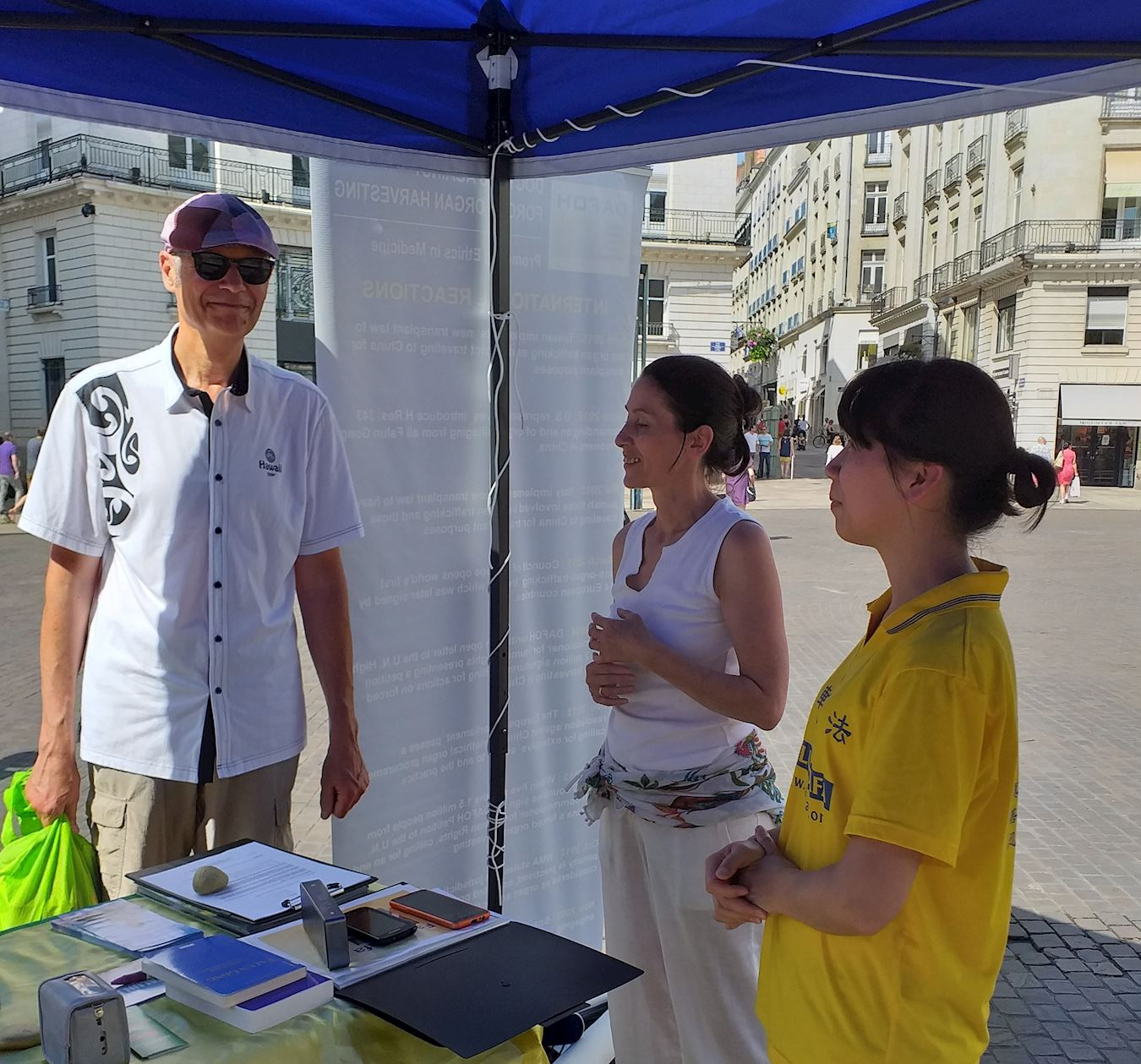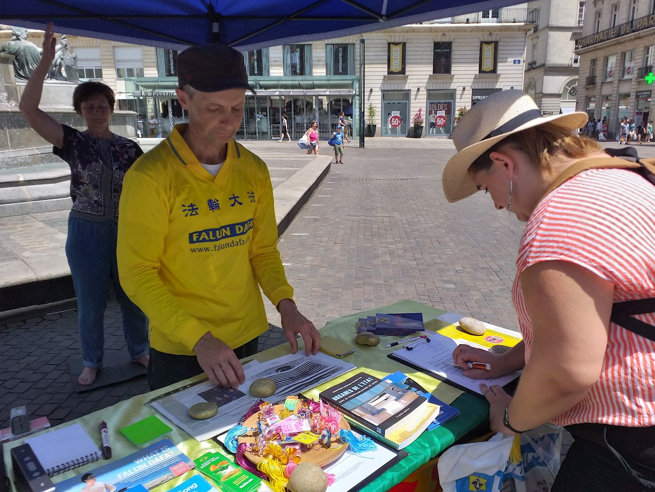 人们了解到,法轮功自1992年在中国大陆开始弘传,一直到1999年7月都是得到中国政府支持的,但中共当时的党魁江泽民害怕亿万民众信仰真、善、忍,1999年7月,江氏集团动用中共全部国家机器,开始大规模地残酷迫害法轮功,甚至活体强摘和贩卖法轮功学员器官。善良的法国民众听到这些,纷纷表示不能接受在当今社会还存在着这么残忍的事情,他们都签名支持法轮功学员反迫害。