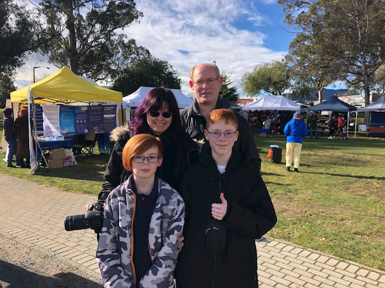 瑞恩(Ryan)是位会计师,现在正是学校假期,他带着他的妻子崔西(Tracy)和两个儿子伊桑(Ethan)和利亚姆(Liam)来陶波度假,妻子崔西一直在拍照,她赞叹道,他们今天运气真好,恰好能赶上法轮功学员的舞龙队的表演。学员们的演出不是木偶戏,而是非常流畅,很棒!