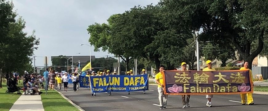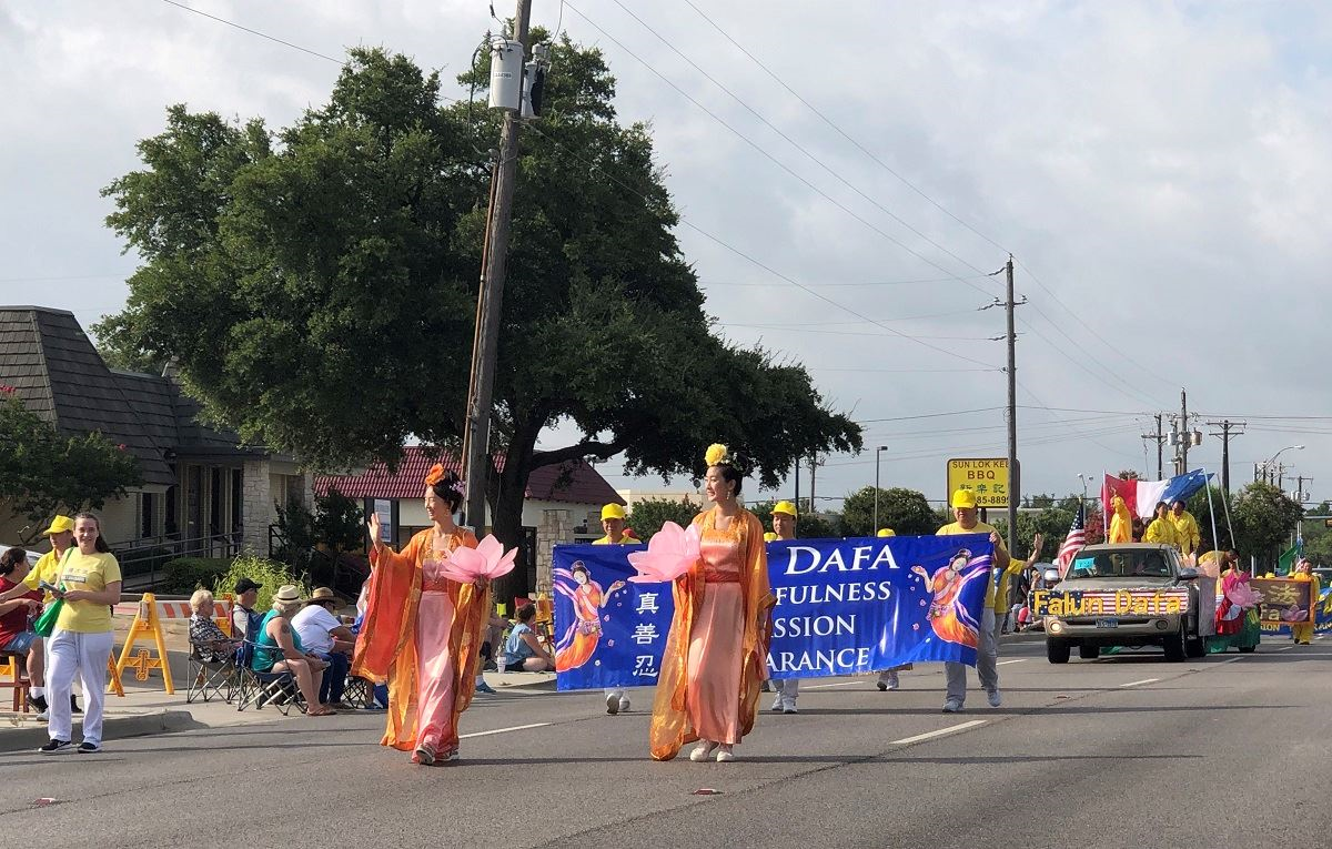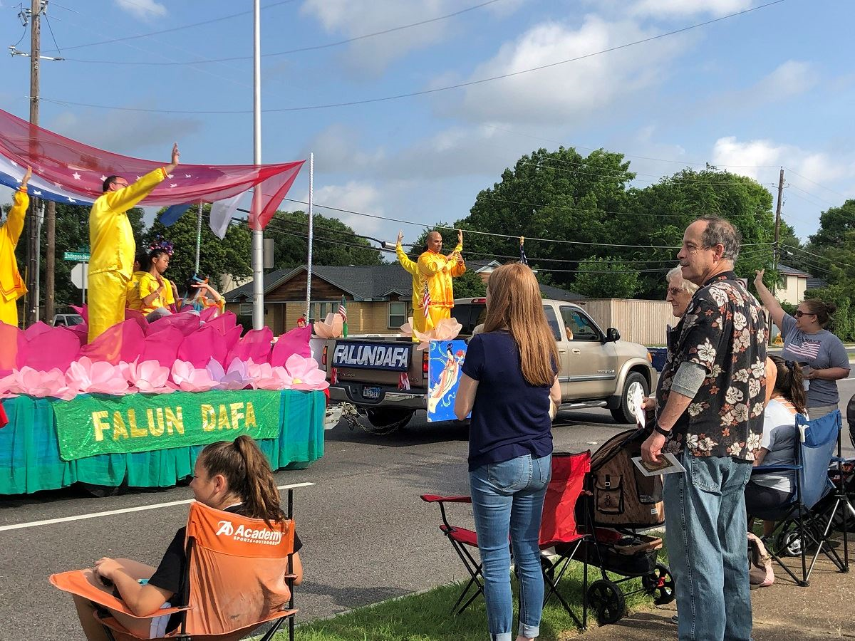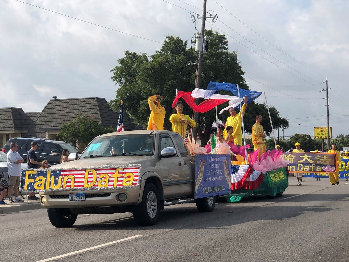 布兰诺市位于德克萨斯州北部,近些年来经济发展迅猛,由此亚裔人口比例也很高,居民们喜爱多元文化。法轮功学员多年来一直参加狮子会举办的国庆大游行,并多次获奖。今年,法轮功学员队伍由花车、各色横幅组成,他们再度出现的时候,人们向他们热情的挥手致意。