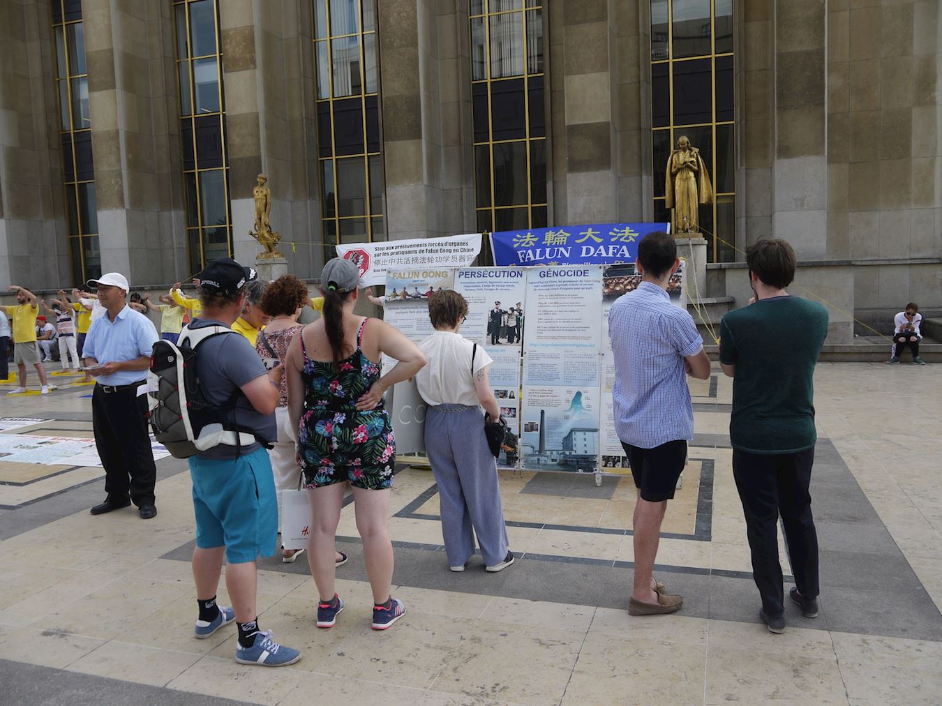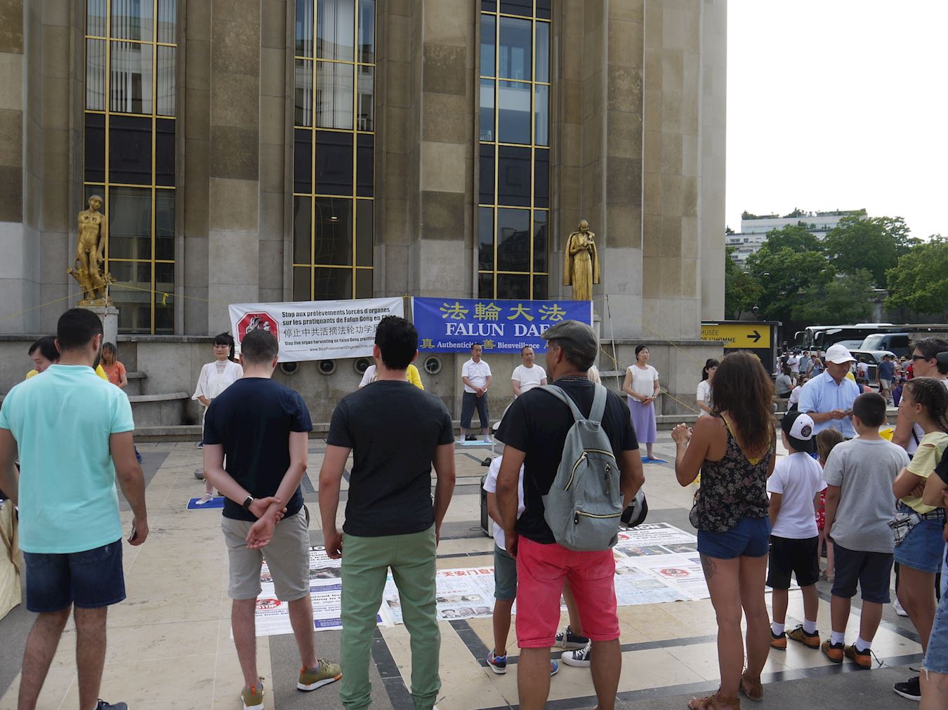 路经法轮功学员的活动地点,人们都会被法轮功学员的炼功打坐所吸引。有些人当场学炼法轮功五套功法,有些人则询问了巴黎炼功点的地址。四、五岁的孩童也会席地而坐,模仿法轮功学员的炼功动作。人们无法理解,以真、善、忍为准则,修炼这样祥和、健身的功法,在中国会遭到迫害、酷刑,甚至被强摘器官。人们纷纷签字支持法轮功,谴责中共罪行。