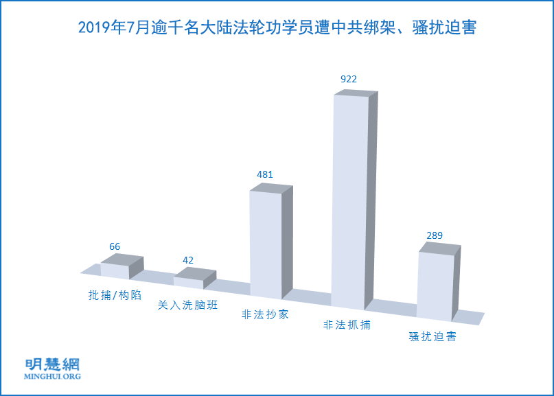 | 2019年7月份,中共绑架922名法轮功学员。 | |||||