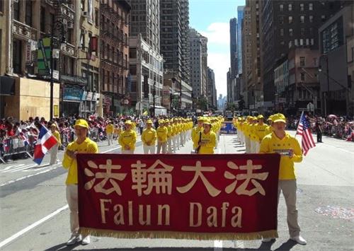 游行队伍中有色彩缤纷的花车,很多表演队伍穿着多米尼加的传统服饰。法轮功学员亮丽的服装、整齐的队伍、铿锵的鼓声、舒缓的炼功动作以及蓬勃向上的精神面貌,在游行中大放异彩,受到民众的热烈欢迎。