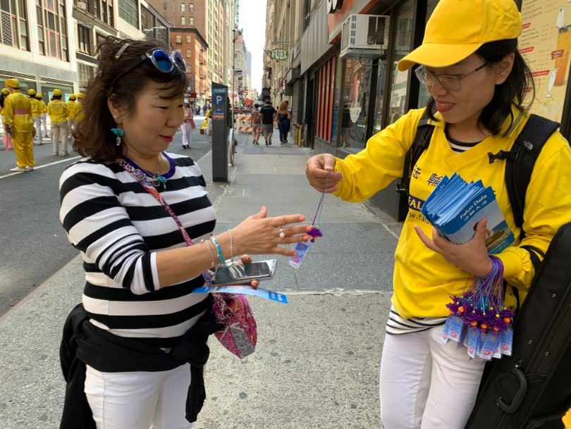 ![]() 图4:韩裔民众很高兴接过法轮功学员赠送的小莲花。 |