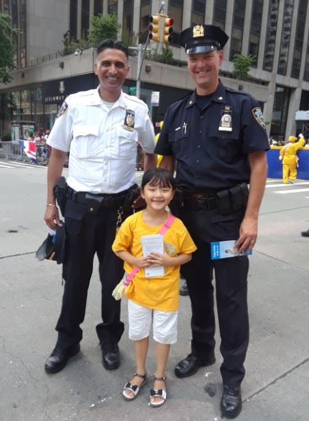 ![]() 图5:维护治安的警察接过法轮功小弟子发给的传单,并高兴地与之合影。 |