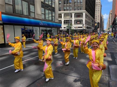法轮大法腰鼓队第一次应邀参加该游行,带来具有浓郁中国传统文化色彩的腰鼓队表演,她们身着中国传统服饰,民众一看就知道是华人的队伍。腰鼓队表演了《法轮大法好》、《三:退.进行曲》、《天灭中共进行曲》等乐曲,鼓声铿锵有力,响彻云霄,震撼人心。街道两旁民众高声欢呼,喝彩,人们纷纷拿起手机录像、拍照,喜不自胜。