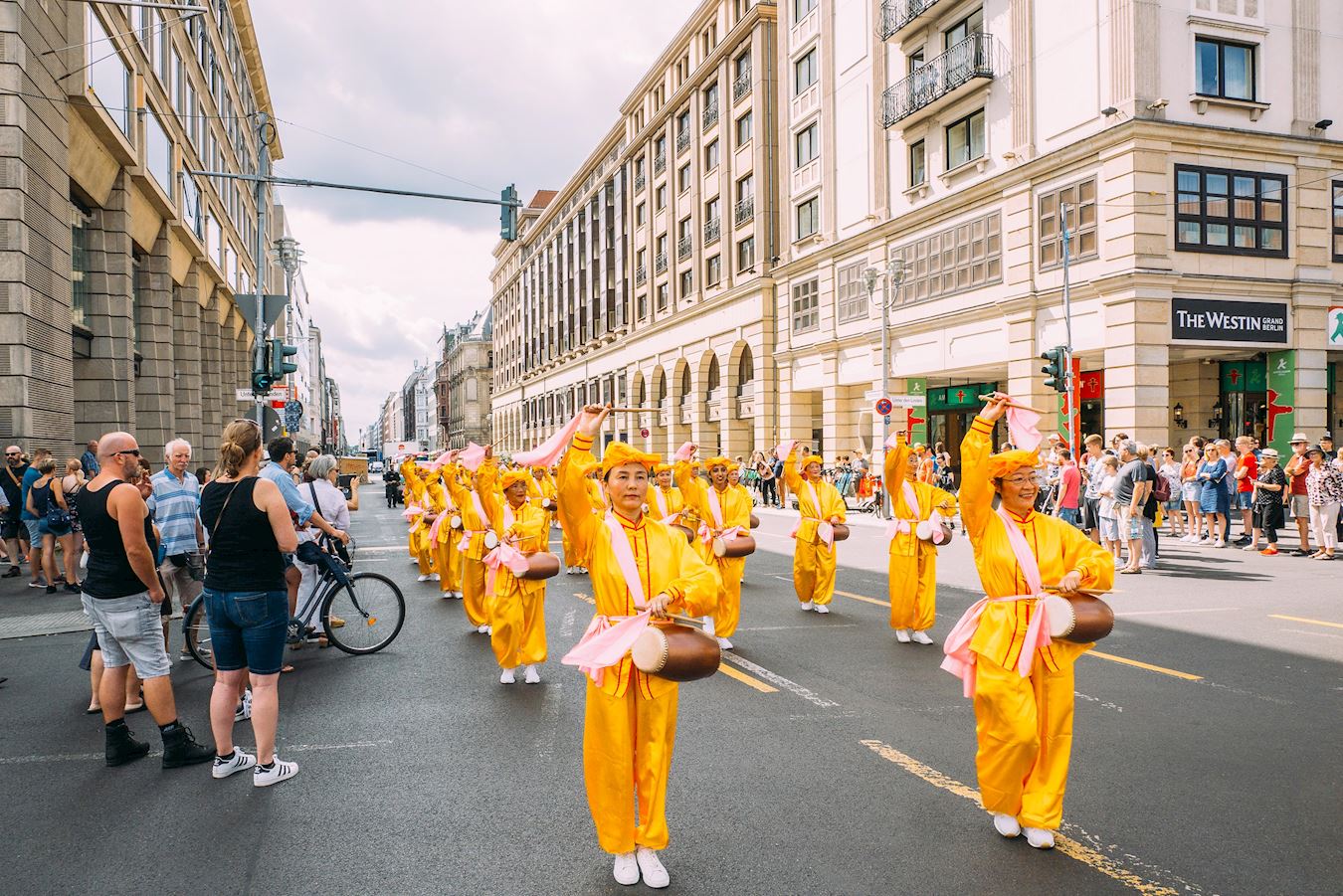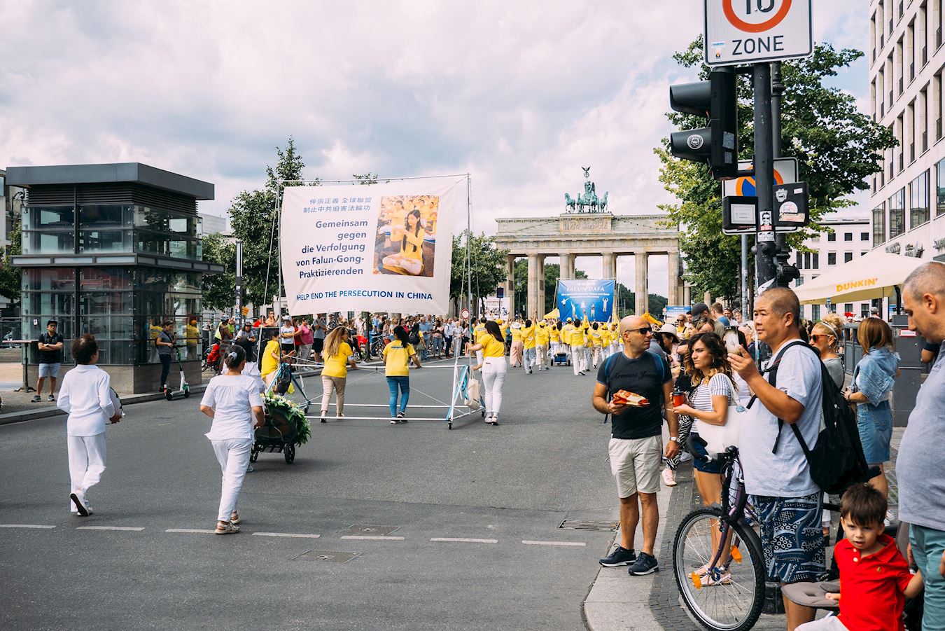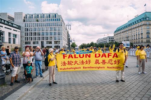 广东来的王姓夫妇在勃兰登堡门前,一直笑着观看法轮功学员集会的场景,表示“感觉非常好,心情很愉快”。另一对来德国探亲的大陆夫妇觉得游行队伍非常好,男士竖着大拇指说:“好!”女士说看了之后心情“特别舒服”。