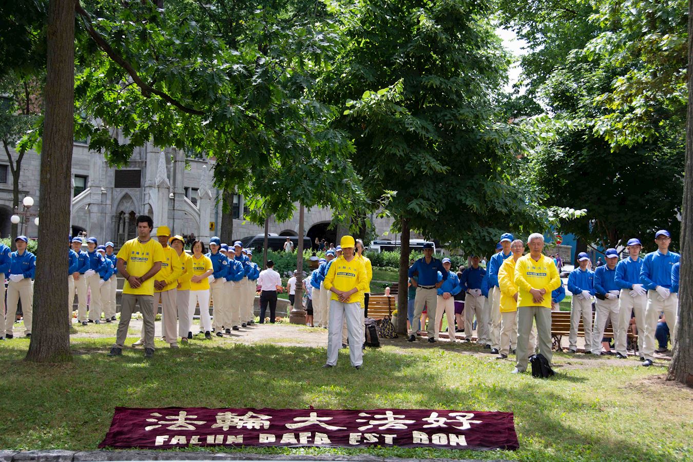 由五十名法轮功学员组成的炼功队,在游行中展示了法轮功的功法。法轮功以宇宙最高特性“真、善、忍”为指导,按照宇宙演化原理而修炼,动作舒缓、简单易学,能迅速净化身体。