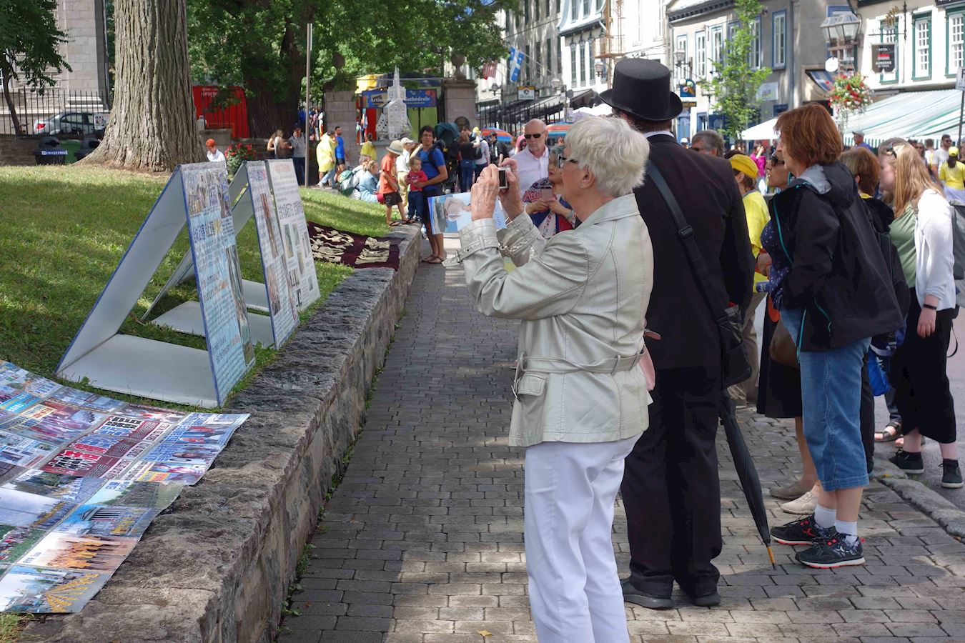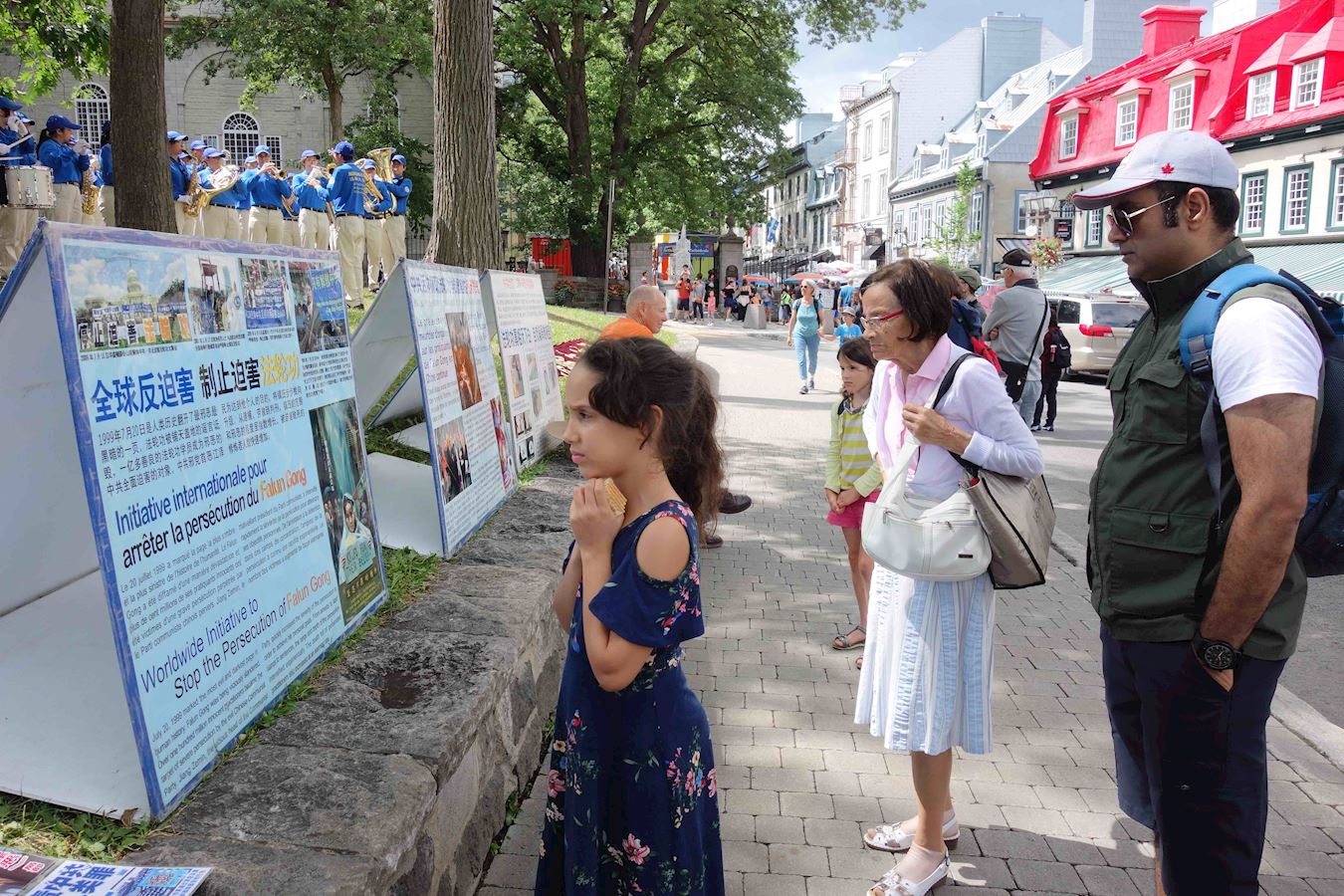 一位带着孩子来德国旅游的上海女士在博物馆里听到的天国乐团的演奏,觉得音乐很好听,很好奇地跑到街上来看。她说,看到这个游行非常震撼,在这里还有这么多人为法轮功呼吁,还有很多外国人在队伍里,感到队伍那么壮大。之后她又跟法轮功学员交谈了一会儿,了解真相。