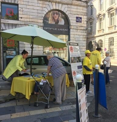 梅阿里先生和其他过往的行人一样,认真阅读了揭露中共强摘法轮功学员器官的真相展板,他表示以前对此一点都不知情,他很认同法轮功做好人的理念。他希望能在里昂市找到炼功点,并会将法轮功的相关信息推荐给他的朋友们。