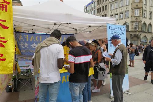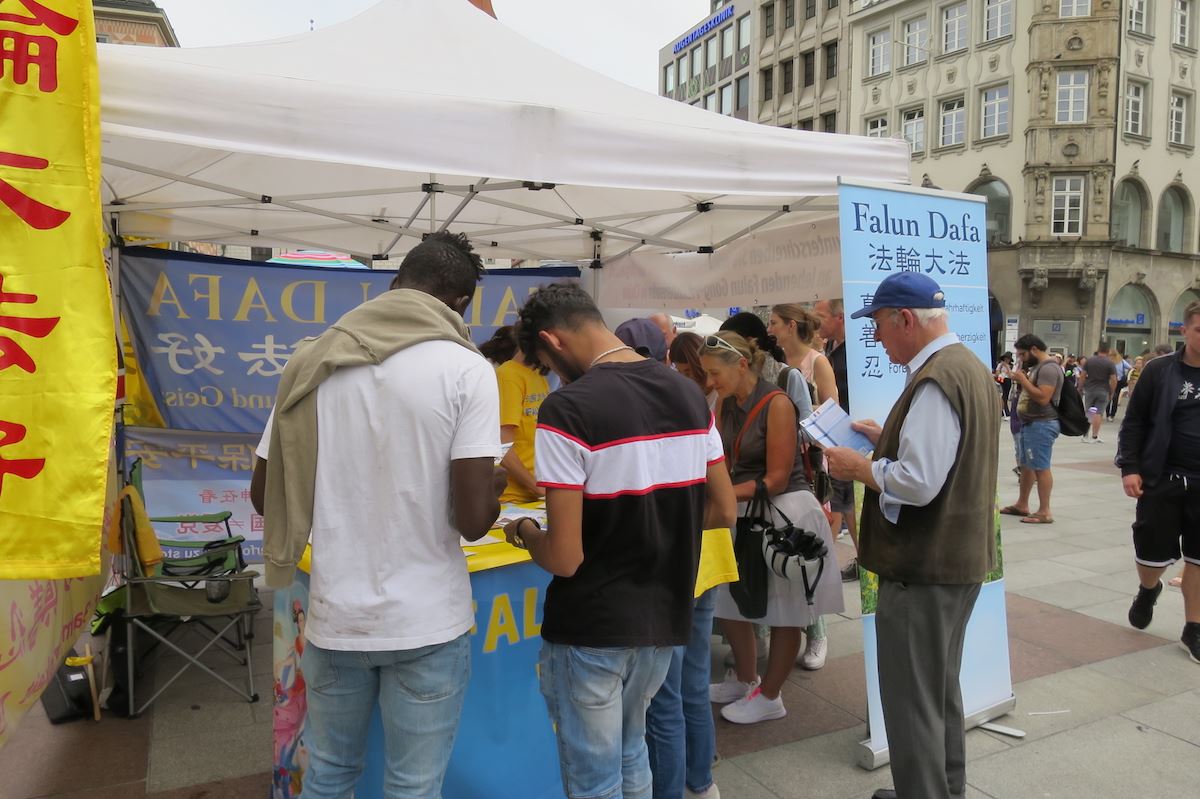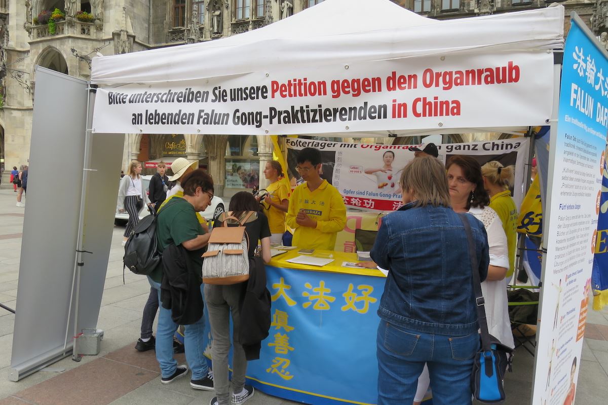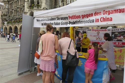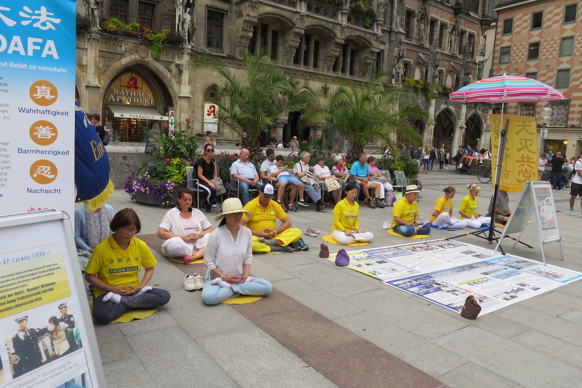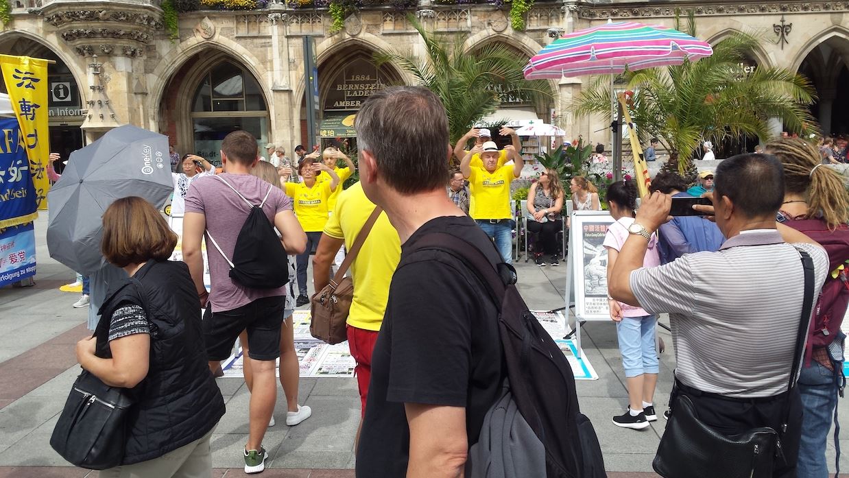 法轮功学员在慕尼黑市中心玛琳广场(Marienplatz)举办了活动,过往民众纷纷签名声援法轮功学员反迫害,也有人当场跟法轮功学员学炼功法。