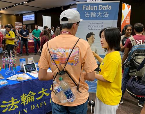八月二十一日的社团招新活动在活动大厅举办。这天的活动也吸引了一些中国学生。一名在美国居住多年的中国女生表示,她以前在香港看过法轮功学员挂的横幅,但是没有仔细了解过。今天有幸再次遇见法轮功学员,她想要多多了解。因为很早就随家人来到美国,她对法轮功在中国遭受的迫害并不了解。听学员讲解后,她才知道中共极力掩盖的真相。她拿了真相光碟并表示回去以后一定仔细观看。