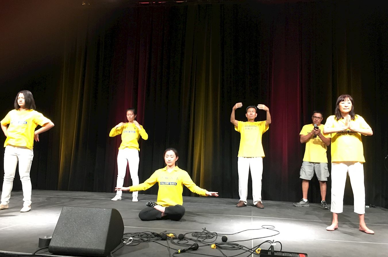 在活动中,法轮大法社团还被邀请上舞台表演五套功法。伴随着舒缓的音乐,功法演示吸引了许多大学新生驻足观看。台上的五名学员分别表演五套功法,四人表演动功,一人打坐。表演结束后,主持人介绍了学法炼功的地点,并且欢迎大家每周来参加。台下的学生纷纷鼓掌。一名美国学生大声说:“你们的表演真棒!”