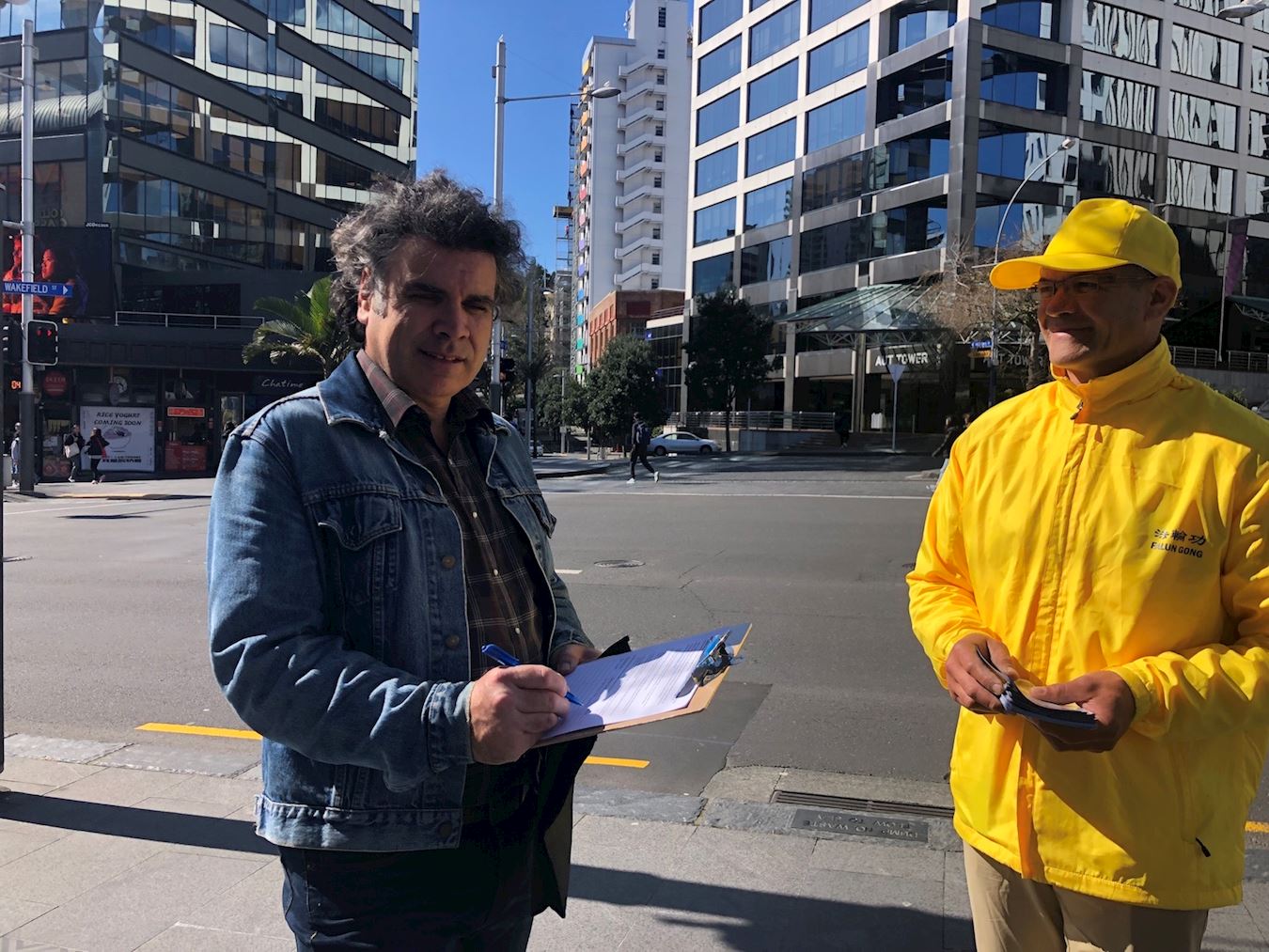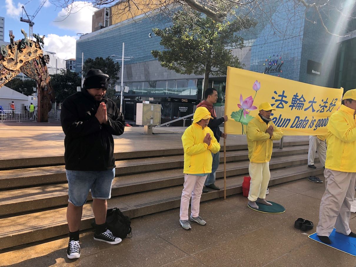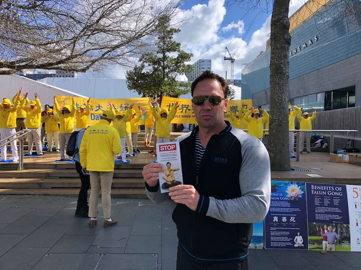 克里斯·斯密斯(Chris Smith)一周前,从新西兰的另外一个城市来到奥克兰,看到法轮功学员在市中心炼功讲真相后,他每天都到市中心炼功点来炼一会儿功,他要和法轮功学员站在一起,表示他的支持。炼功时,他能够感受到整个能量场,还有快乐、宁静和祥和。