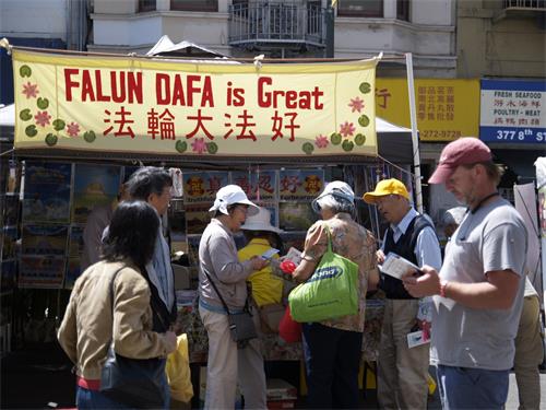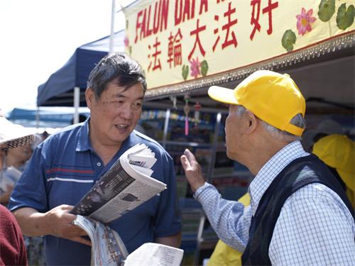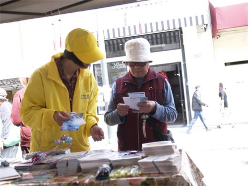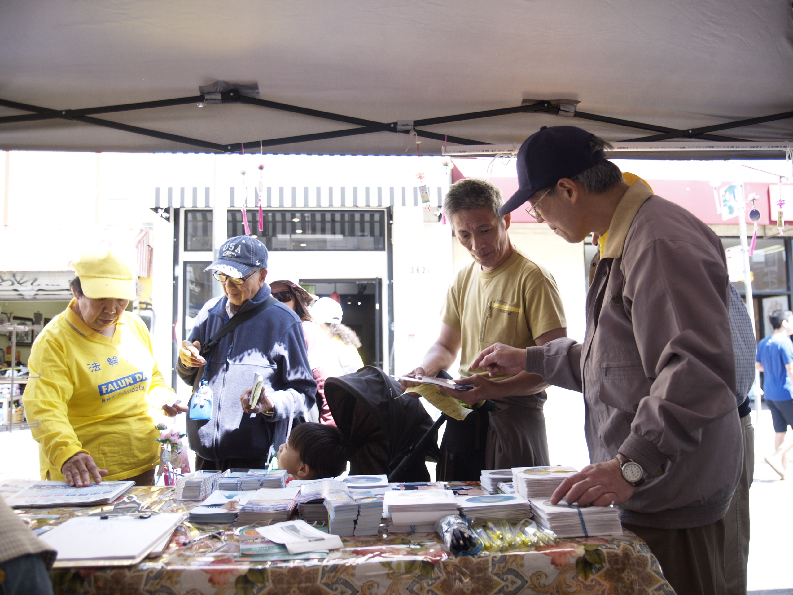 当天的奥克兰中国城车水马龙,好不热闹,法轮功学员在摊位上准备了各种介绍法轮功以及揭露中共的真相资料,还有《·九·评*共产党》等真相资料,经过摊位了解真相的人们络绎不绝。许多华人主动了解真相,当天有一百四十多人三:退.(退出中共邪*党-及其团、队组织)