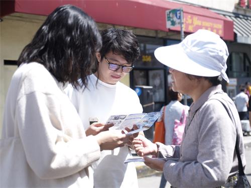 有一位西人叫麦克辛,他索取法轮大法资料后,非常仔细阅读,并认真观看了介绍法轮大法及迫害真相的图片后,气愤表示:中共政权太邪恶;人们应该反对它。也有一位华人唐先生在阅读完真相图片后也表达了类似看法。