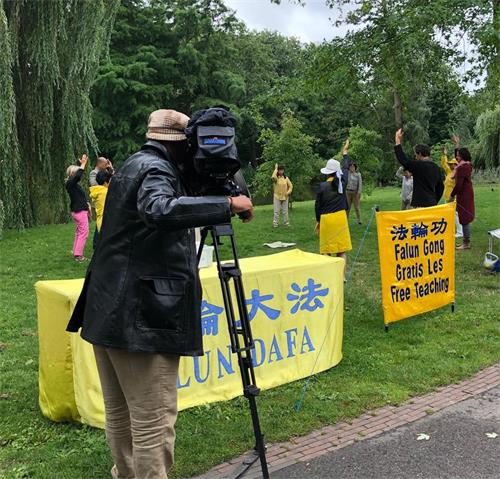 ![]() 图1: 荷兰阿姆斯特丹AT5电视台拍摄并采访了在公园炼功的法轮功学员们。 |