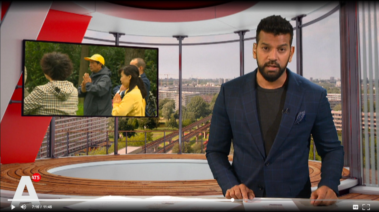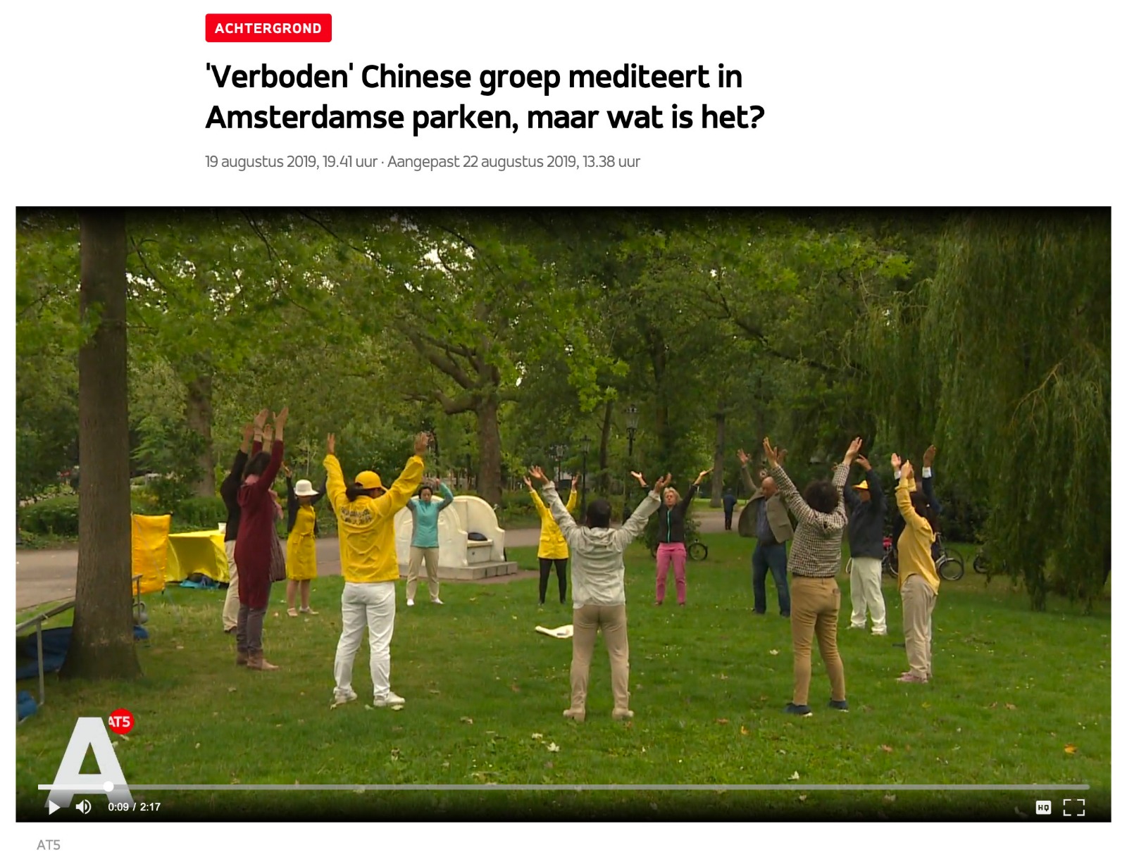二零一九年八月十九日晚七点四十一分,荷兰阿姆斯特丹AT5电视台播出了关于法轮功的报道。节目拍摄了法轮功学员在公园的炼功场景,并且采访了现场几位法轮功学员在中国遭受酷刑迫害的经历。与此同时,电视台也在其网站www.at5.nl上登出了相关文章,题为:“被禁止的中国团体在阿姆斯特丹公园里打坐炼功,他们是怎样的一个团体呢?”电视节目和报道引起荷兰市民关注。