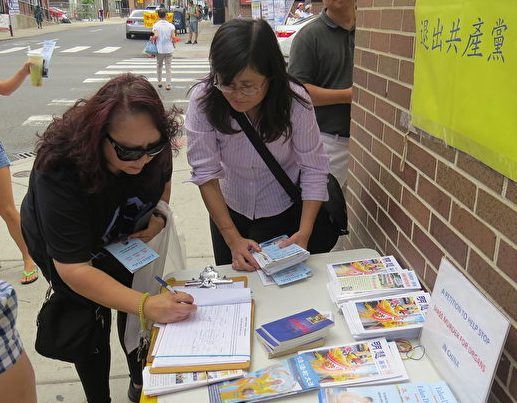 许多过往民众在看到横幅后好奇地上前询问,并与法轮功学员交谈。华裔女孩Hannah居住在费城东北区,她过去对法轮功了解很少。在与学员交谈后,她对在中国大陆发生的迫害、尤其中共活摘法轮功学员器官感到不可思议。她与好朋友Alina一起签名,呼吁美国国会能通过法案制止这场虐杀。