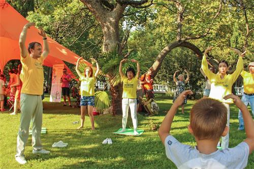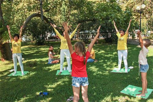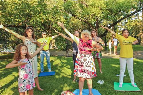 在活动中,学员们展示了法轮功五套功法,很多人当场学炼功法动作。一位来自圣彼得堡的民众说炼功使他充满活力,要把这种活力和内心感受到的平静带回圣彼得堡。