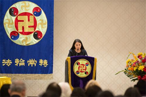 多位青年法轮功学员在法会上交流。这些从小得法的大法小弟子如今已经长大,修炼更加成熟,也在证实法中发挥着越来越多的作用。