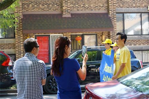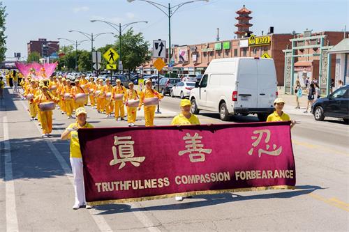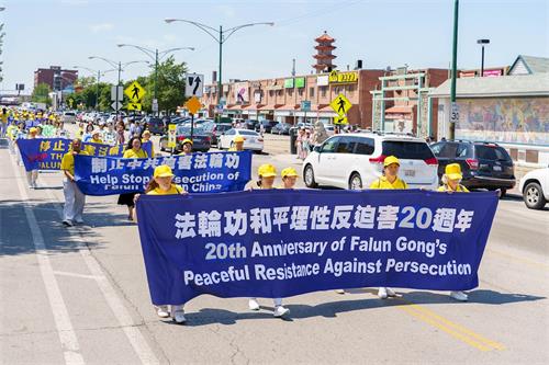 图7~20:二零一九年八月三日,来自美国中部十一个州,包括密西根州、俄亥俄州、印第安纳州、明尼苏达州、密苏里州、威斯康辛州、肯塔基州、内布拉斯加州、堪萨斯州、爱荷华州和伊利诺伊州的部份法轮功学员,再次聚集在美国第三大城市--芝加哥,并在著名景点-中国城,举行了反迫害二十年主题游行。 |