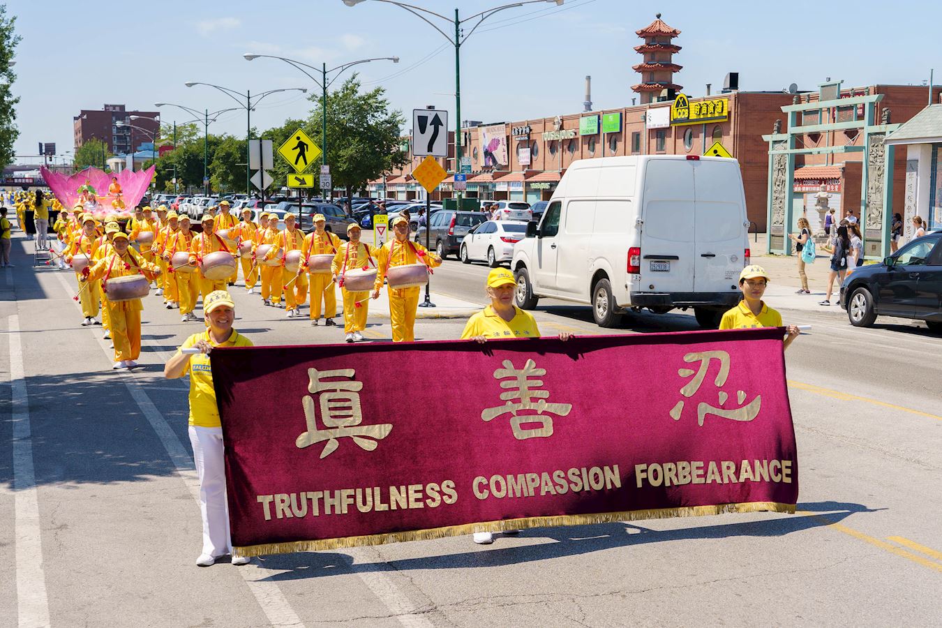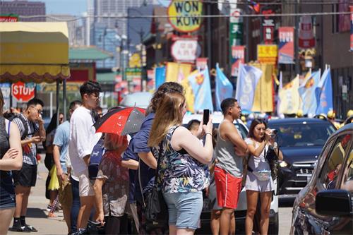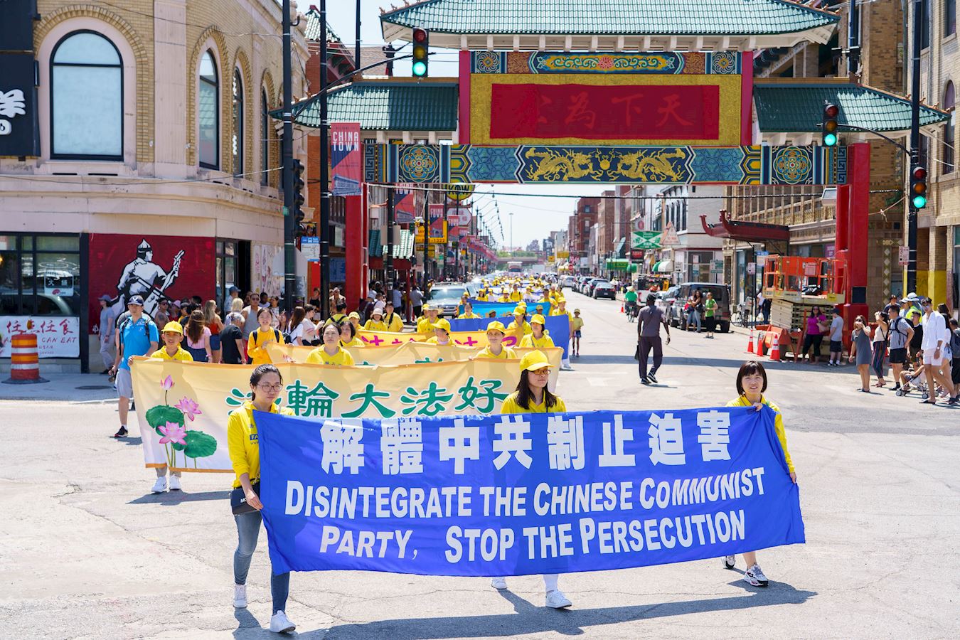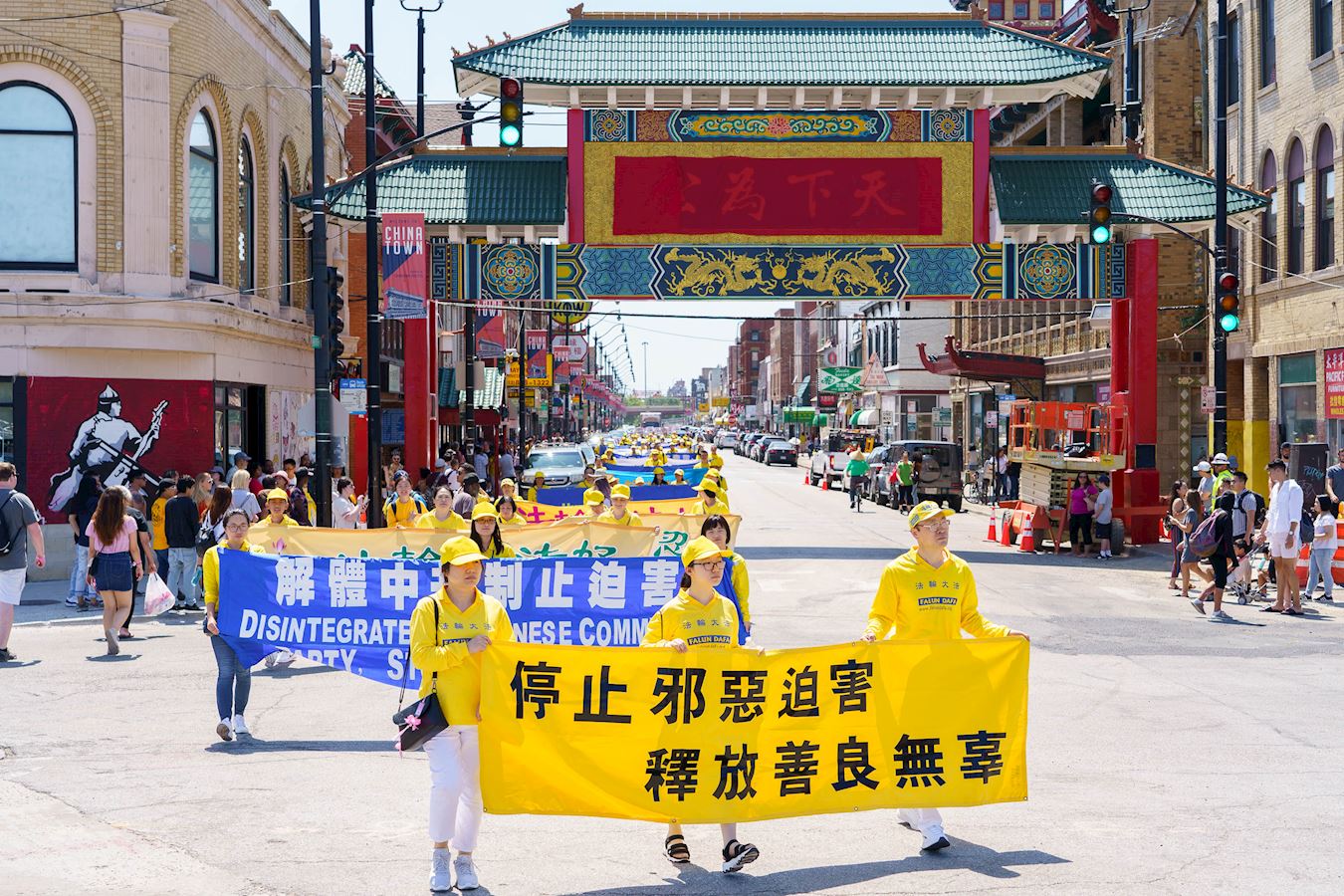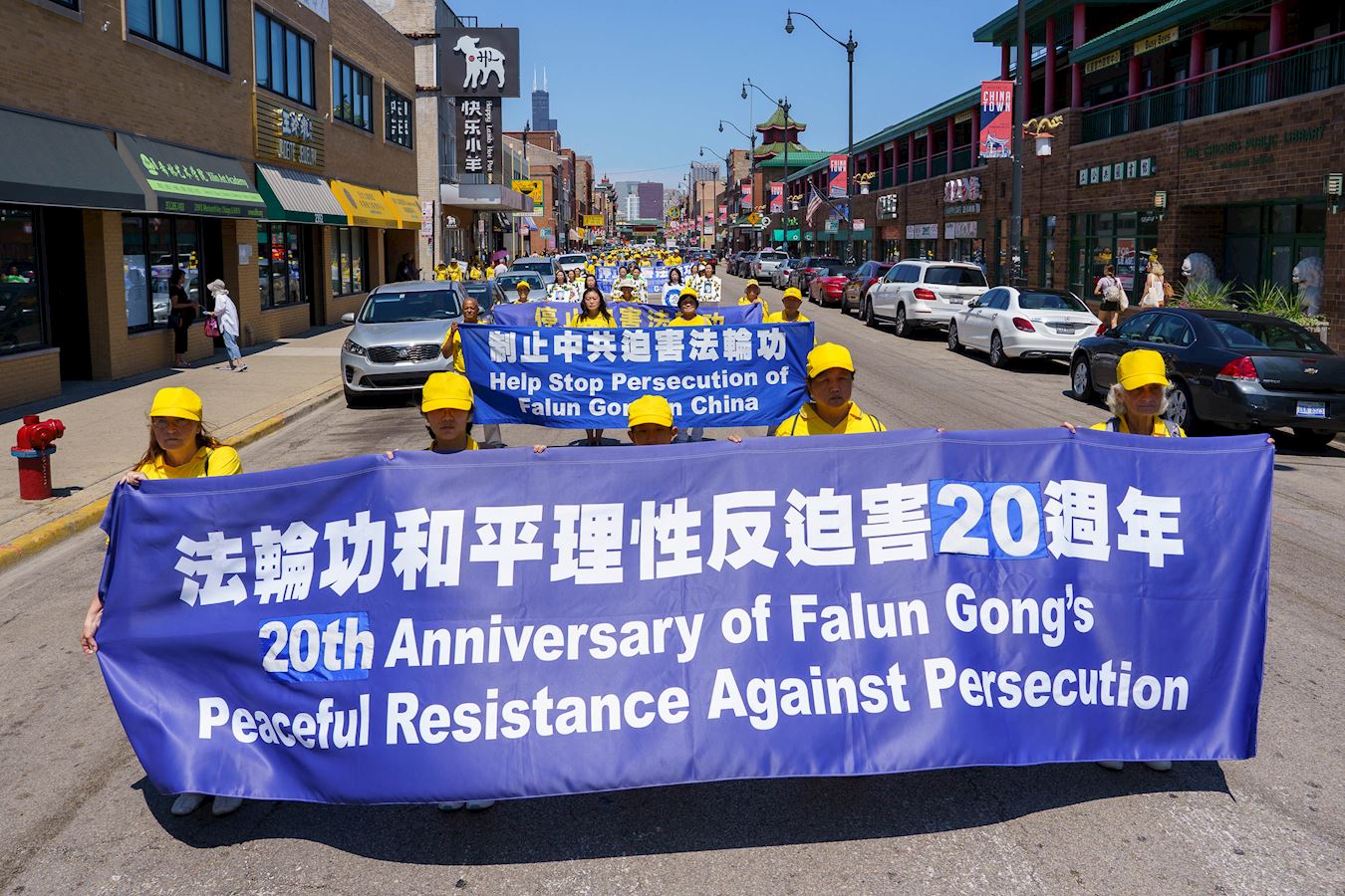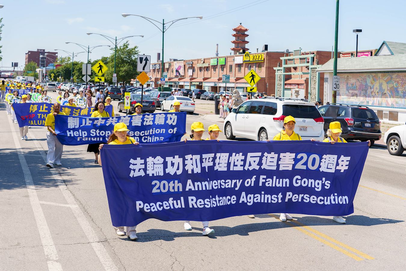【明慧网二零一九年八月五日】二零一九年八月三日,来自美国中部十一个州,包括密西根州、俄亥俄州、印第安纳州、明尼苏达州、密苏里州、威斯康辛州、肯塔基州、内布拉斯加州、堪萨斯州、爱荷华州和伊利诺伊州的部份法轮功学员,再次聚集在美国第三大城市——芝加哥,并在市中心著名景点——中国城,举行了反迫害二十年主题游行,呼吁制止中共对法轮功长达二十年的残酷迫害。法轮功学员们手持中英文“法轮大法好”、“停止迫害法轮功”和“法轮功和平理性反迫害二十周年”等大型横幅,走上中国城中心的永活大街,穿过著名的华埠广场,向中西方民众传递真相,呼吁制止迫害。